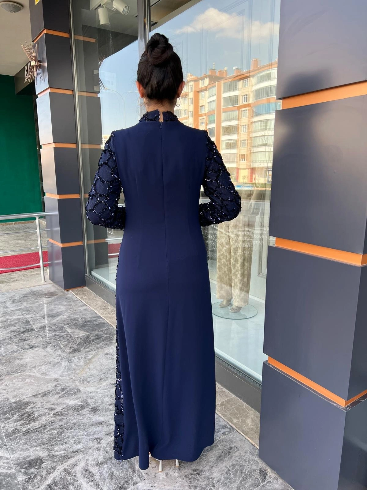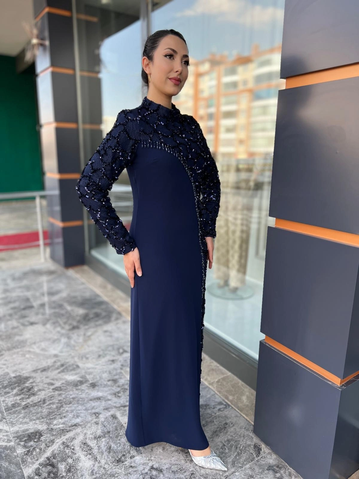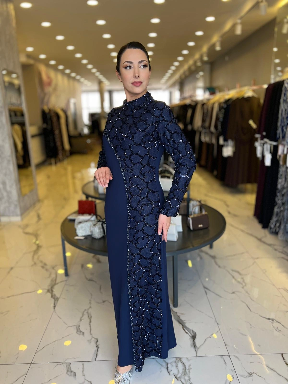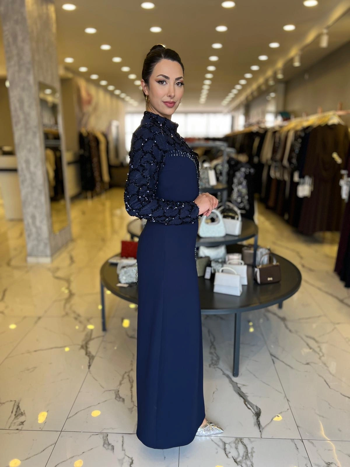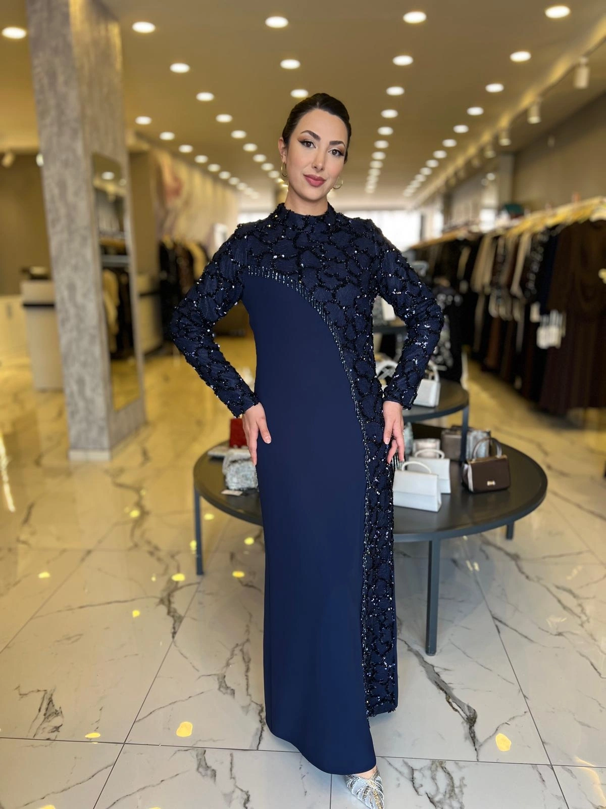 Merihce Luxury kalitesini her detayda hissedeceğiniz BEYOĞLU-PUL DETAYLI ELBİSE LACİVERT, gardırobunuzun vazgeçilmezlerinden biri olmaya aday.
