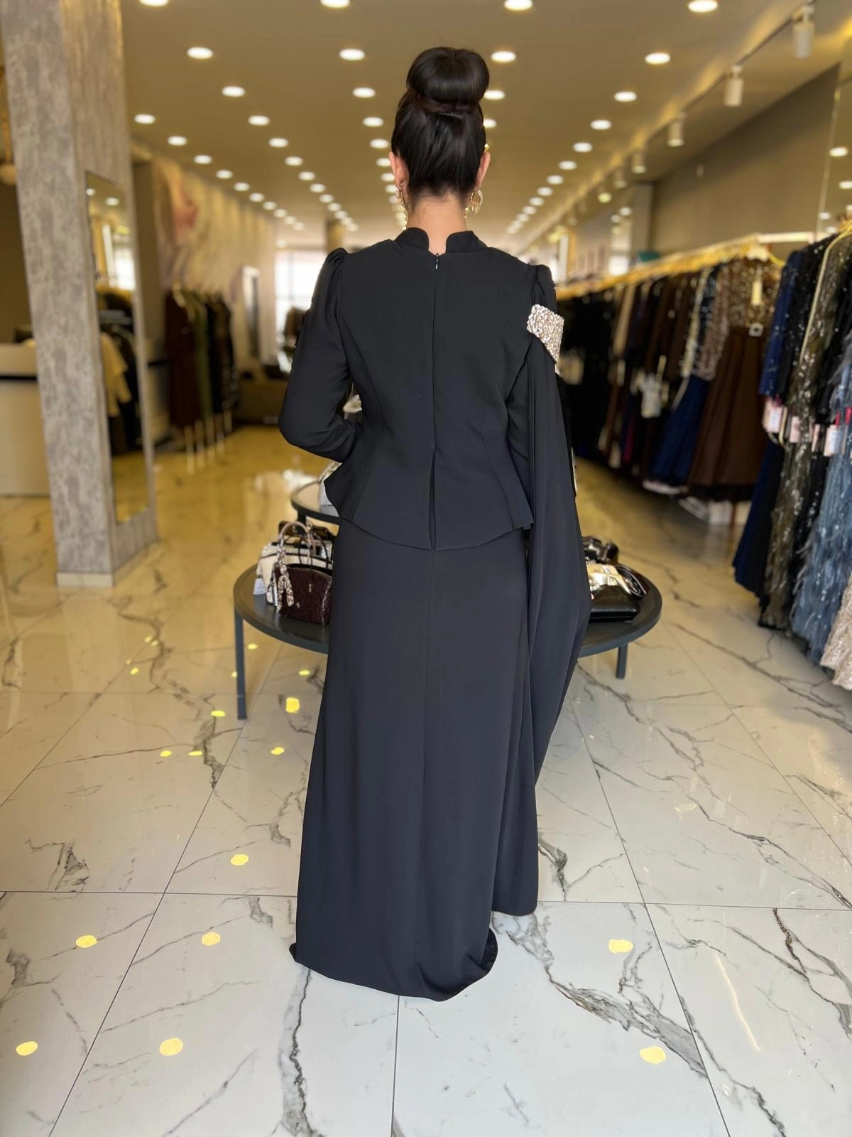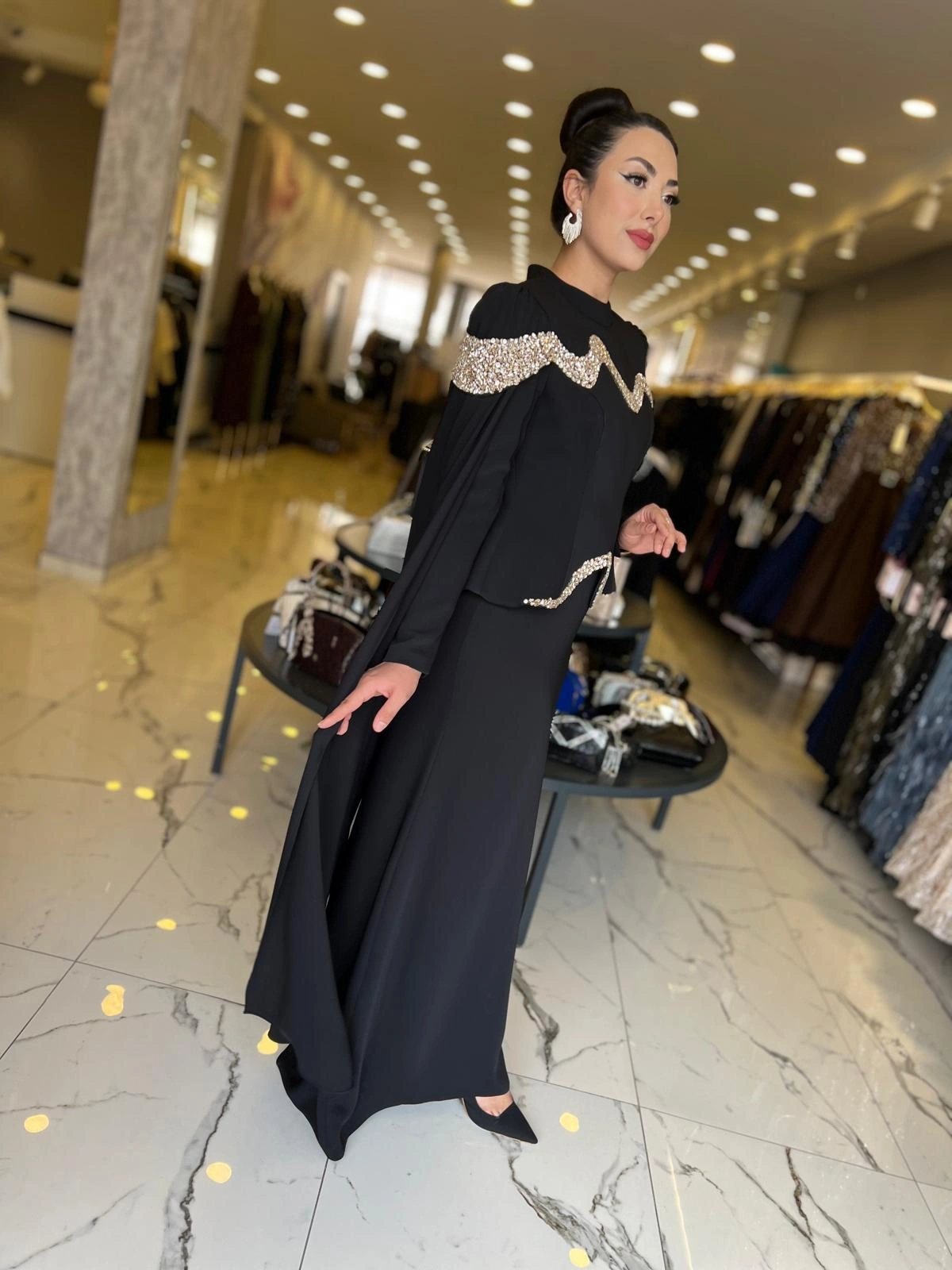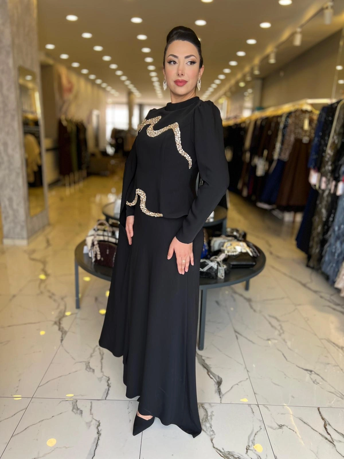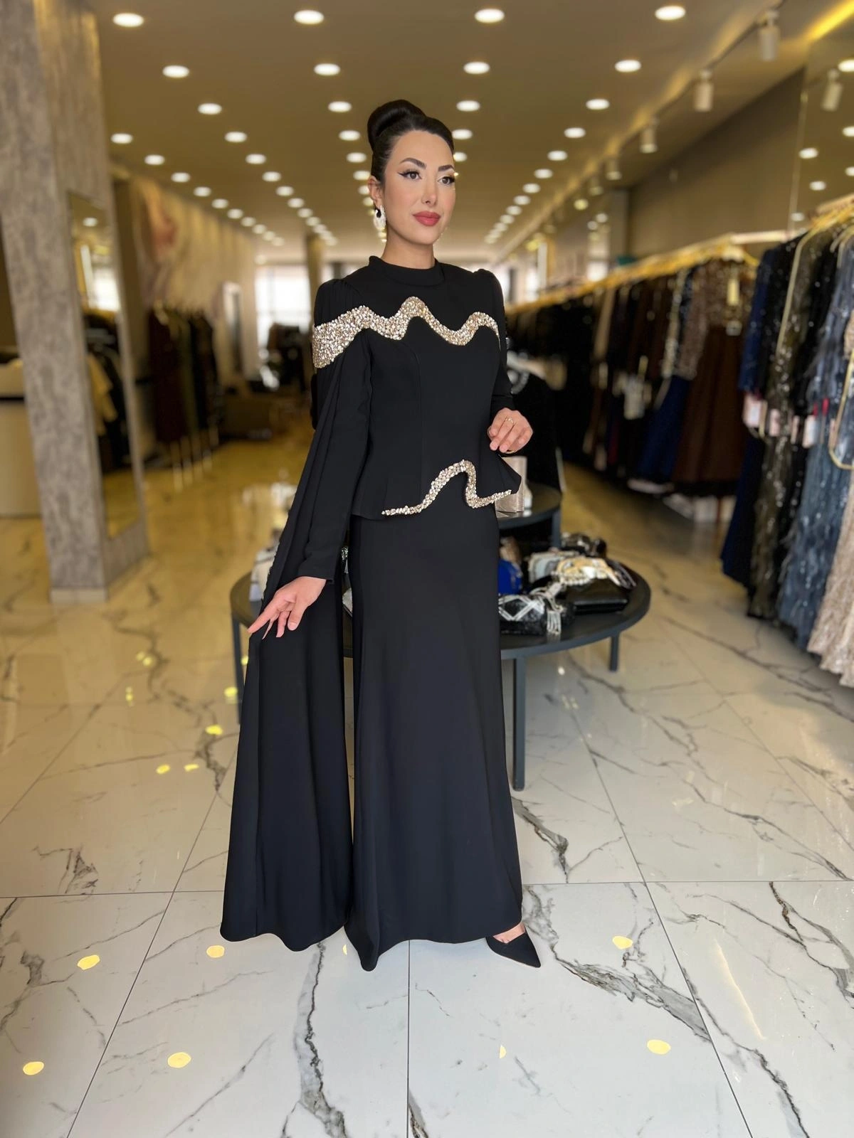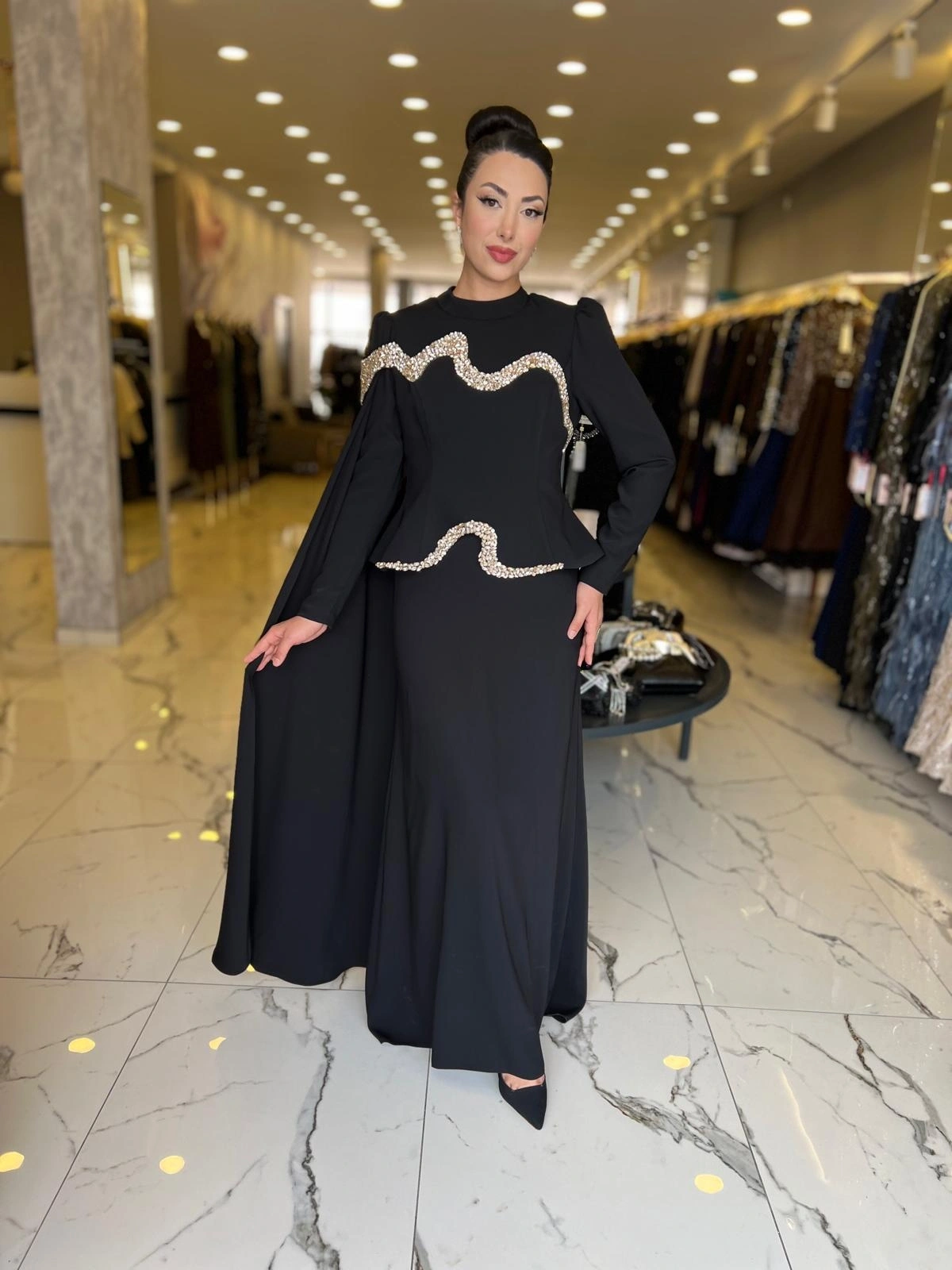 Merihce Luxury kalitesini her detayda hissedeceğiniz FERİHA SARIOĞLU-PANA ABİYE SİYAH, gardırobunuzun vazgeçilmezlerinden biri olmaya aday.