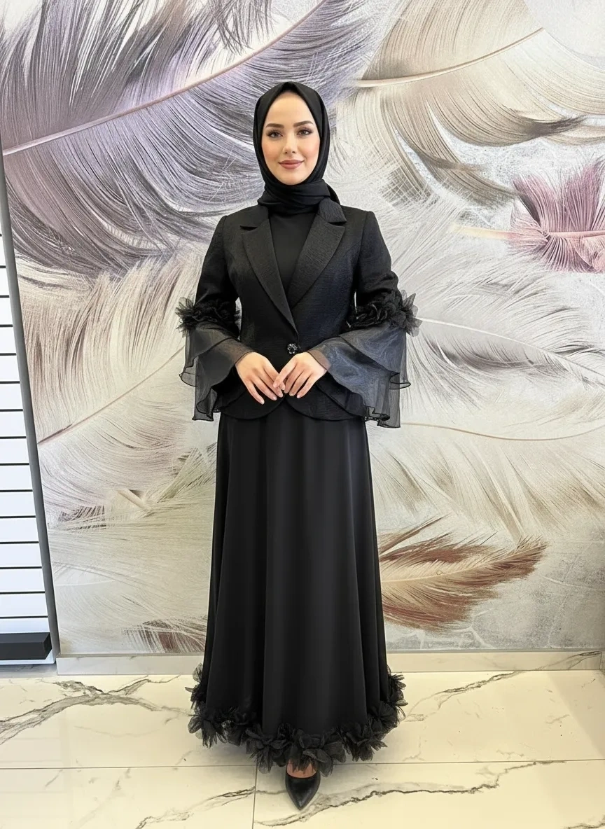 Merihce Luxury kalitesini her detayda hissedeceğiniz GAZELLA-TÜL DETAYLI ETEKLİ TAKIM SİYAH, gardırobunuzun vazgeçilmezlerinden biri olmaya aday.