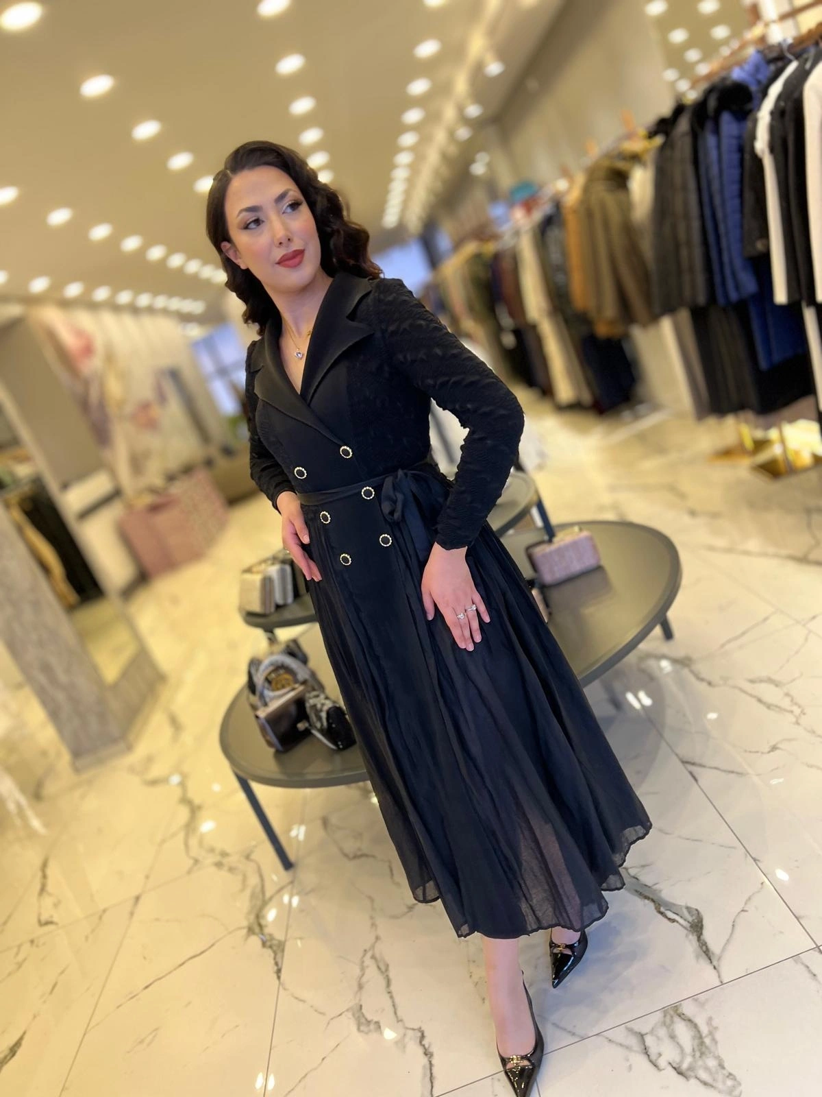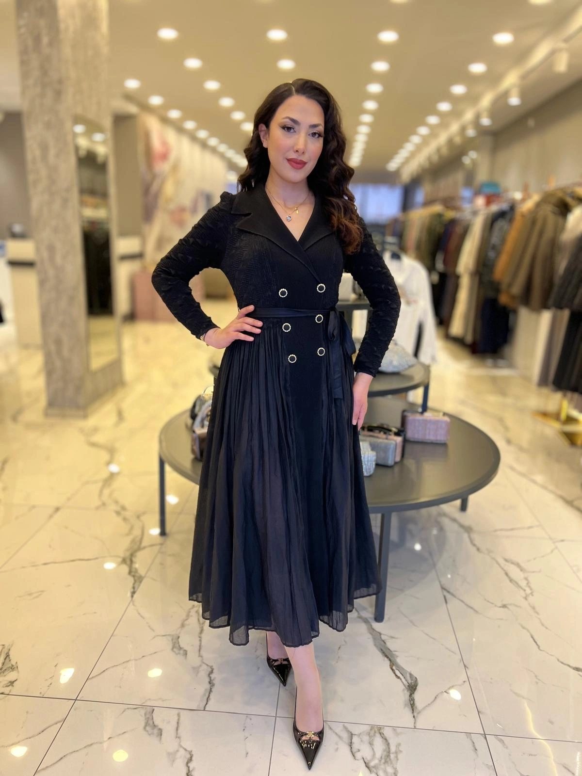 Merihce Luxury kalitesini her detayda hissedeceğiniz İTHAL-ALTI DÜĞMELİ ELBİSE SİYAH, gardırobunuzun vazgeçilmezlerinden biri olmaya aday.