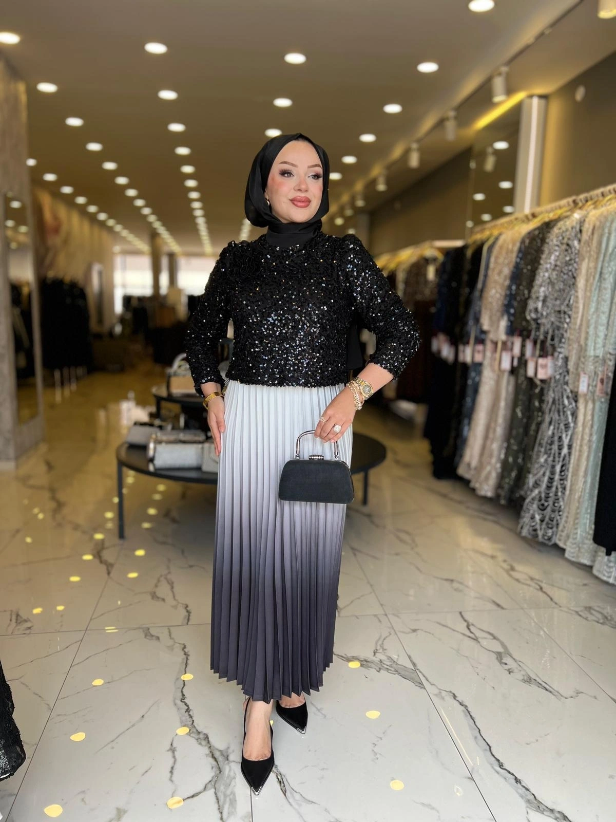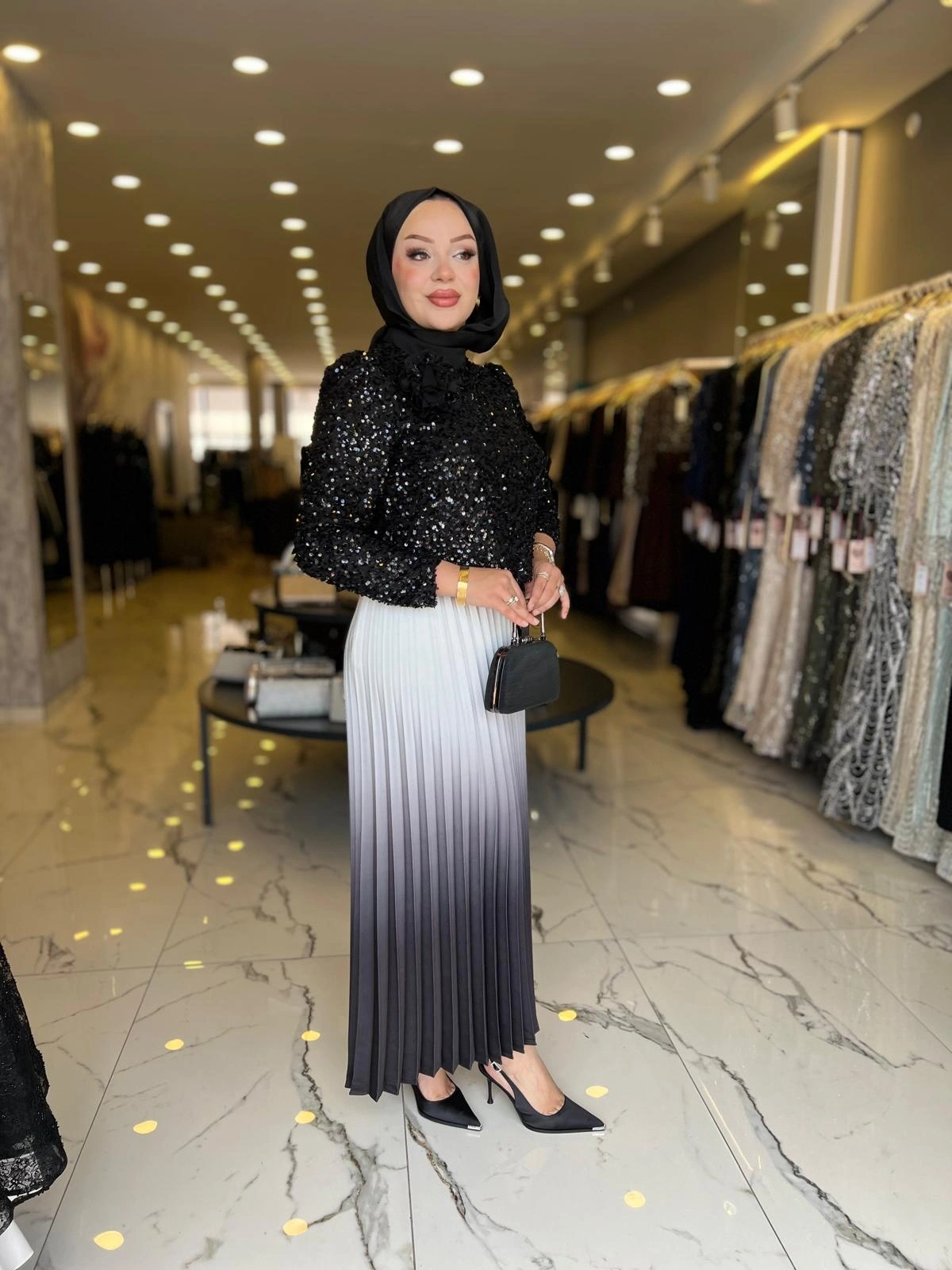 Merihce Luxury kalitesini her detayda hissedeceğiniz MATEKS-ETEĞİ PLİSELİ PAYETLİ TAKIM SİYAH, gardırobunuzun vazgeçilmezlerinden biri olmaya aday.
