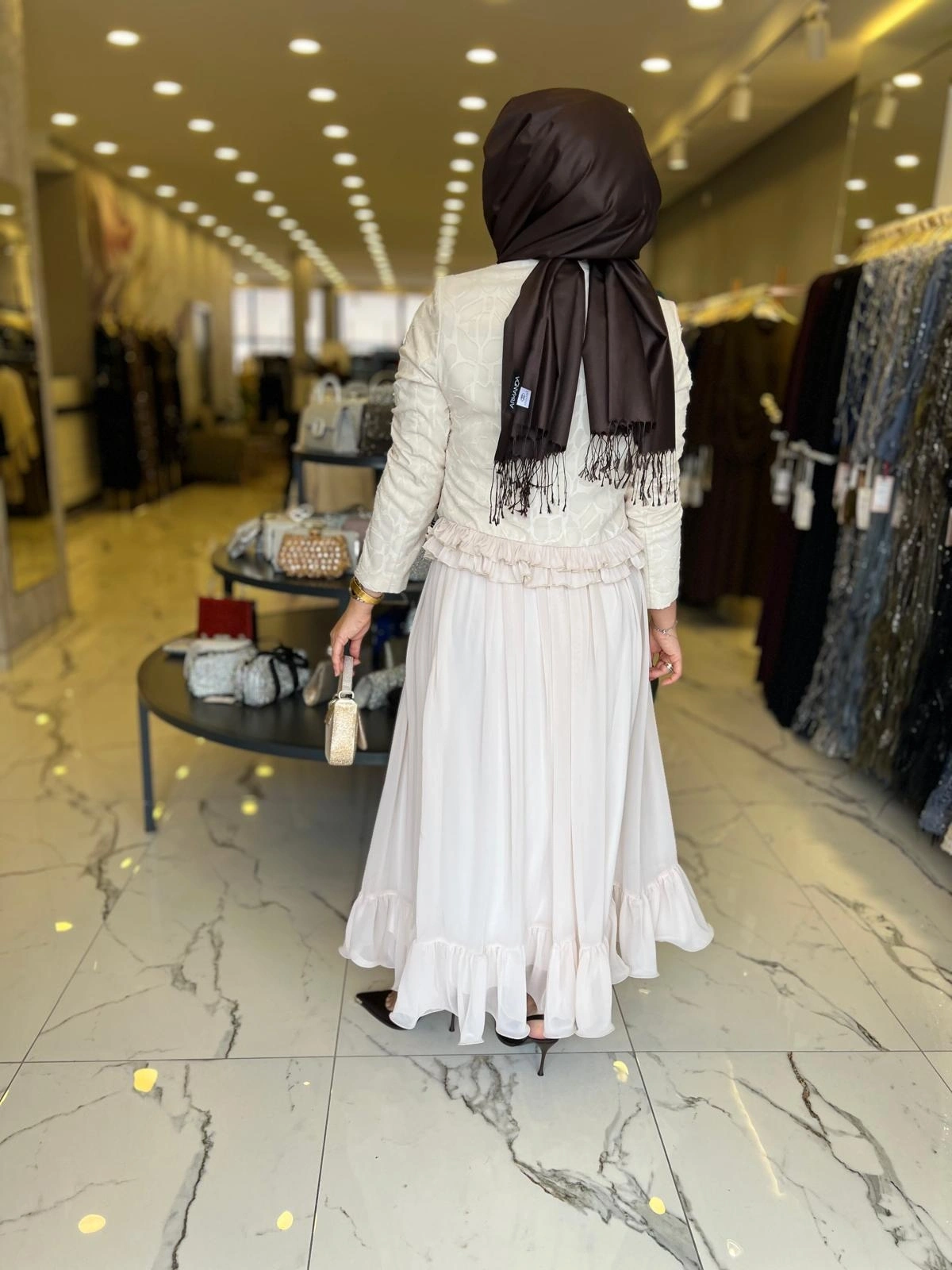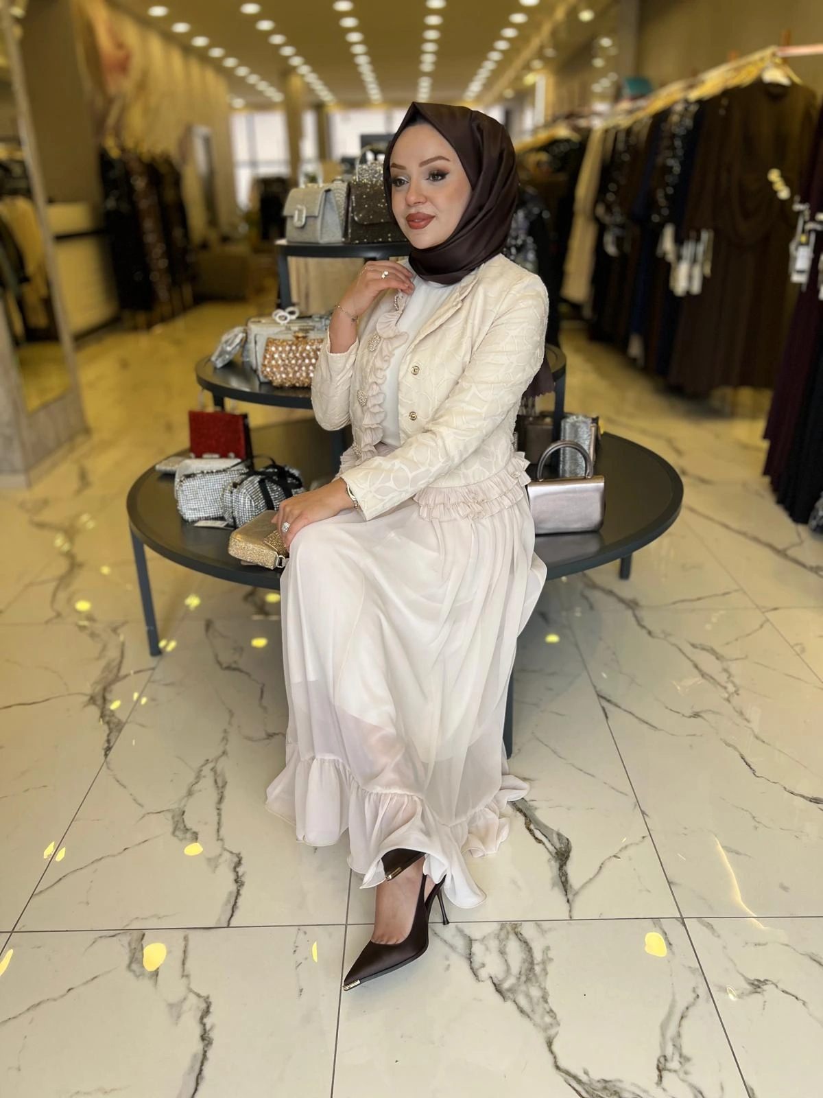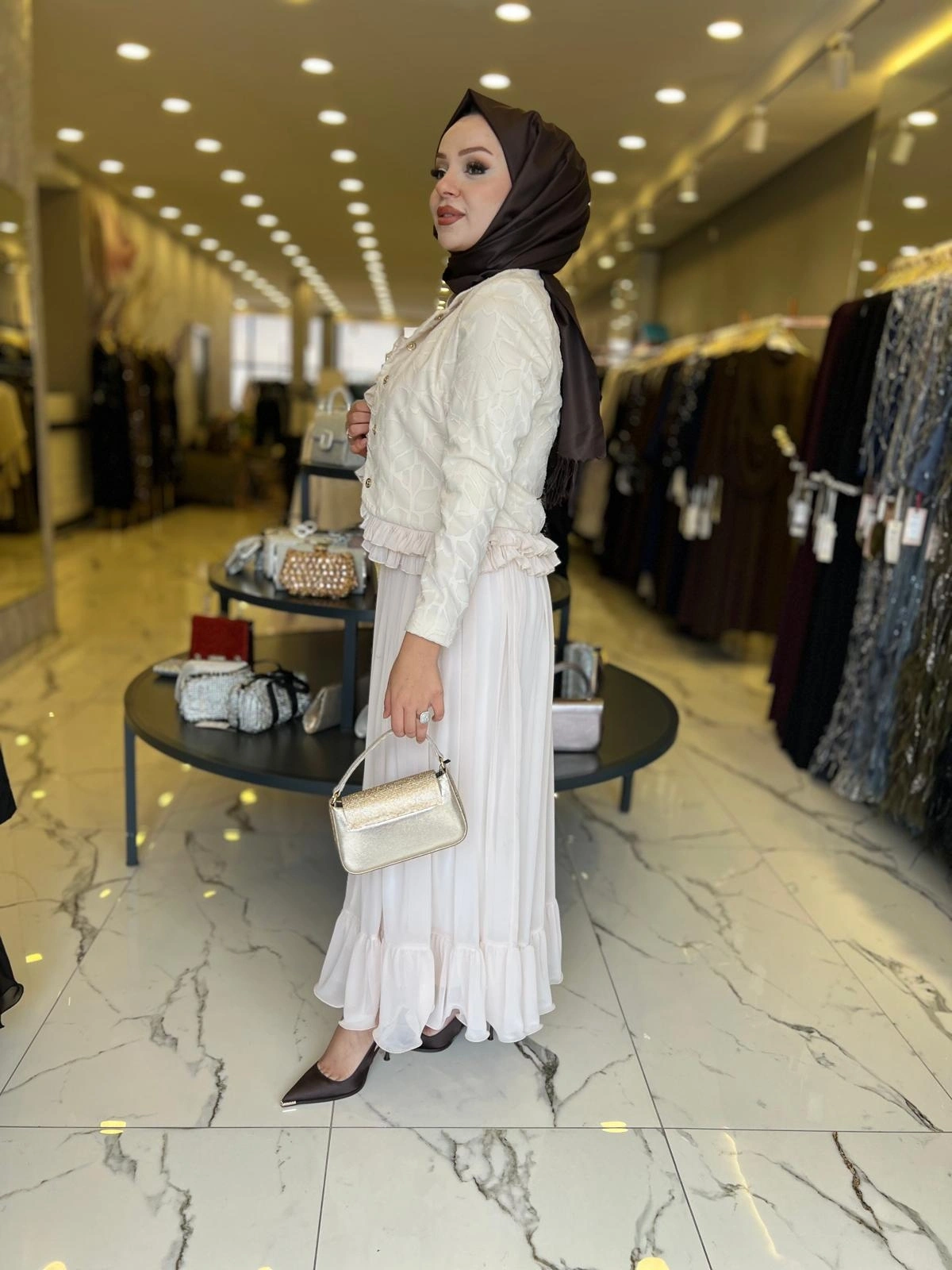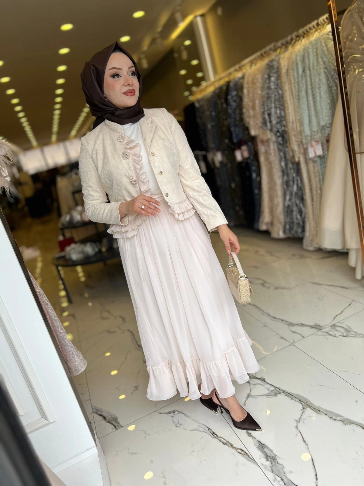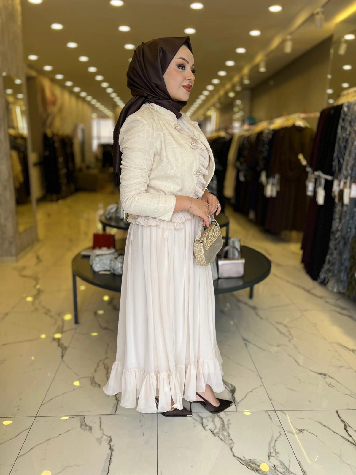 Merihce Luxury kalitesini her detayda hissedeceğiniz MATEKS-İNCİ DETAY ETEKLİ TAKIM BEJ, gardırobunuzun vazgeçilmezlerinden biri olmaya aday.