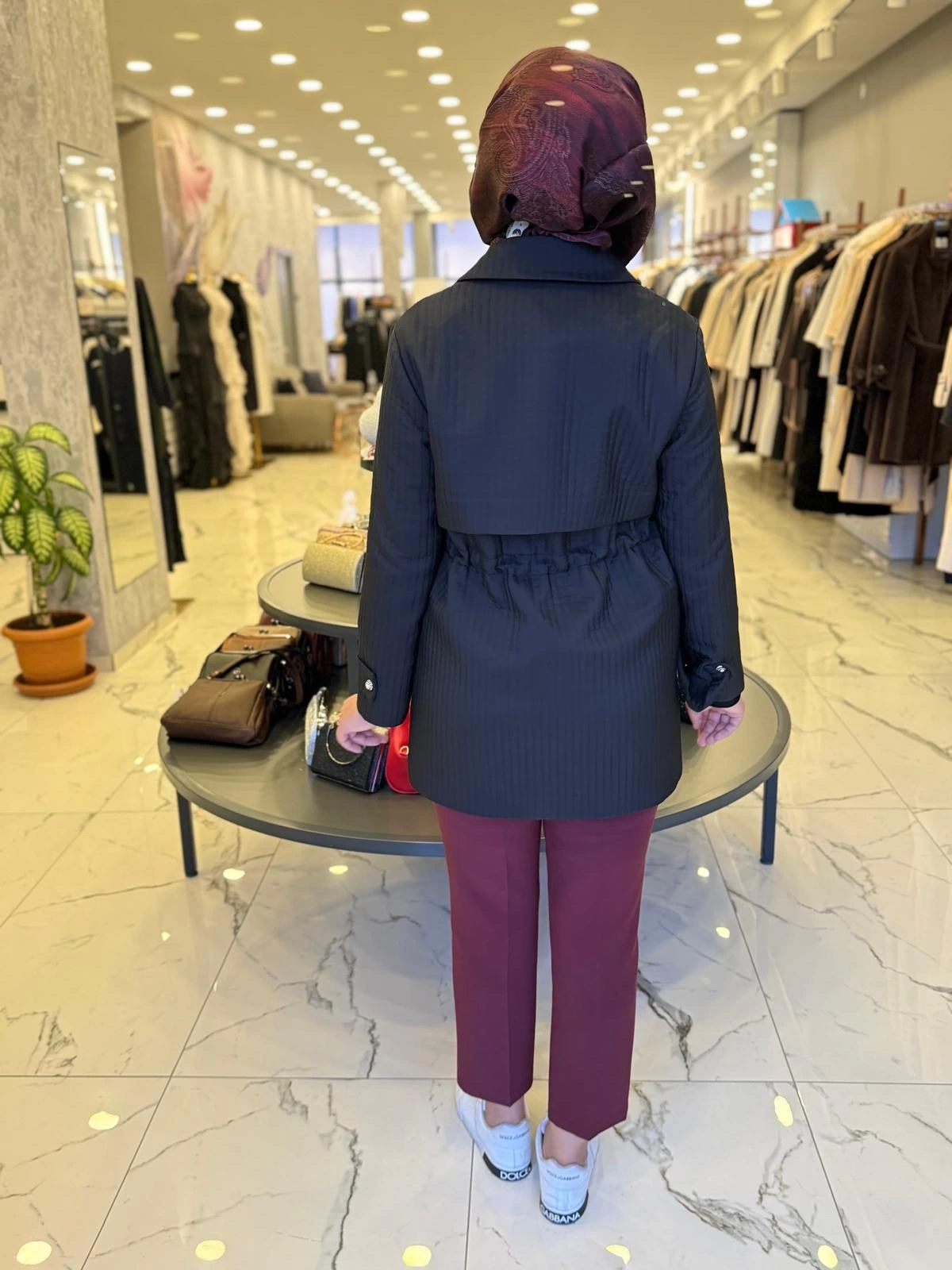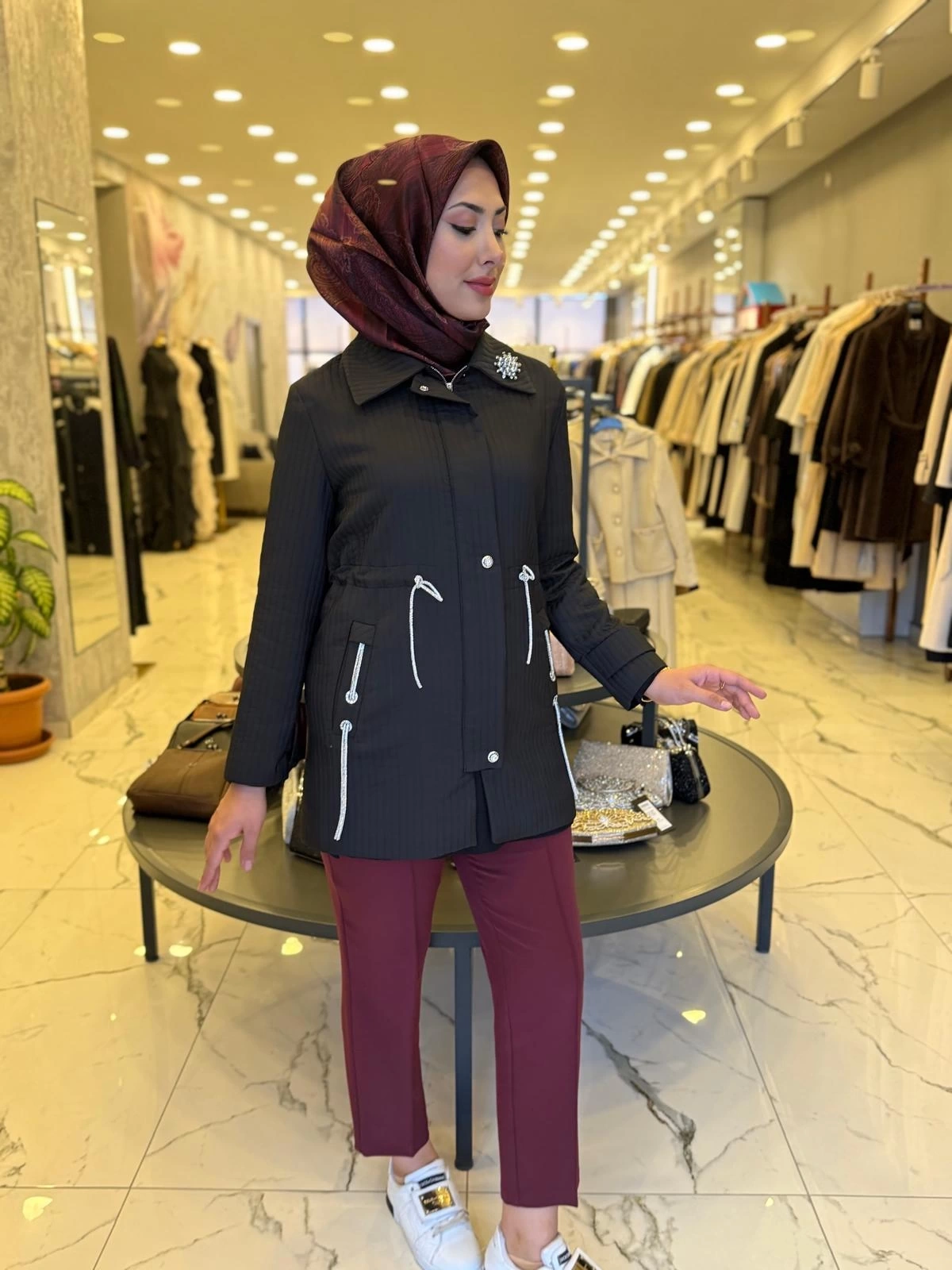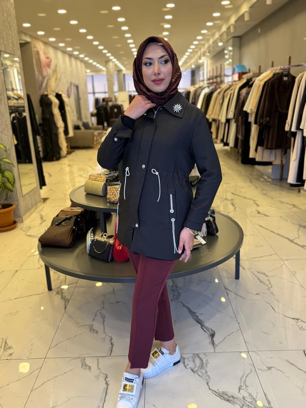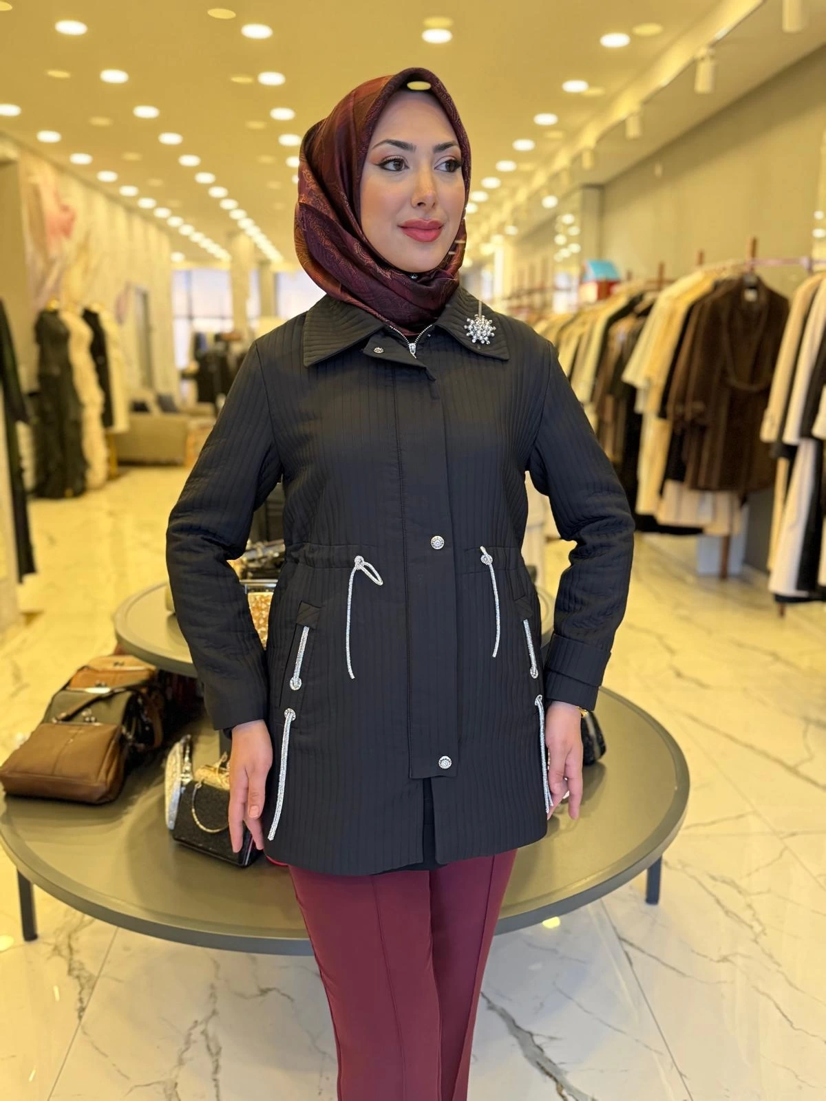 MATEKS-KENDİNDEN ÇİZGİLİ TRENÇ SİYAH