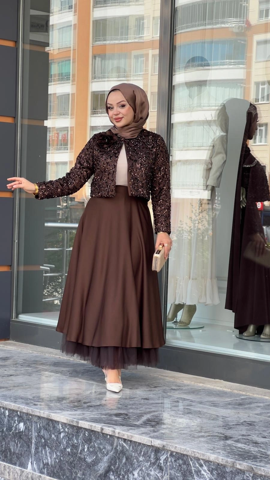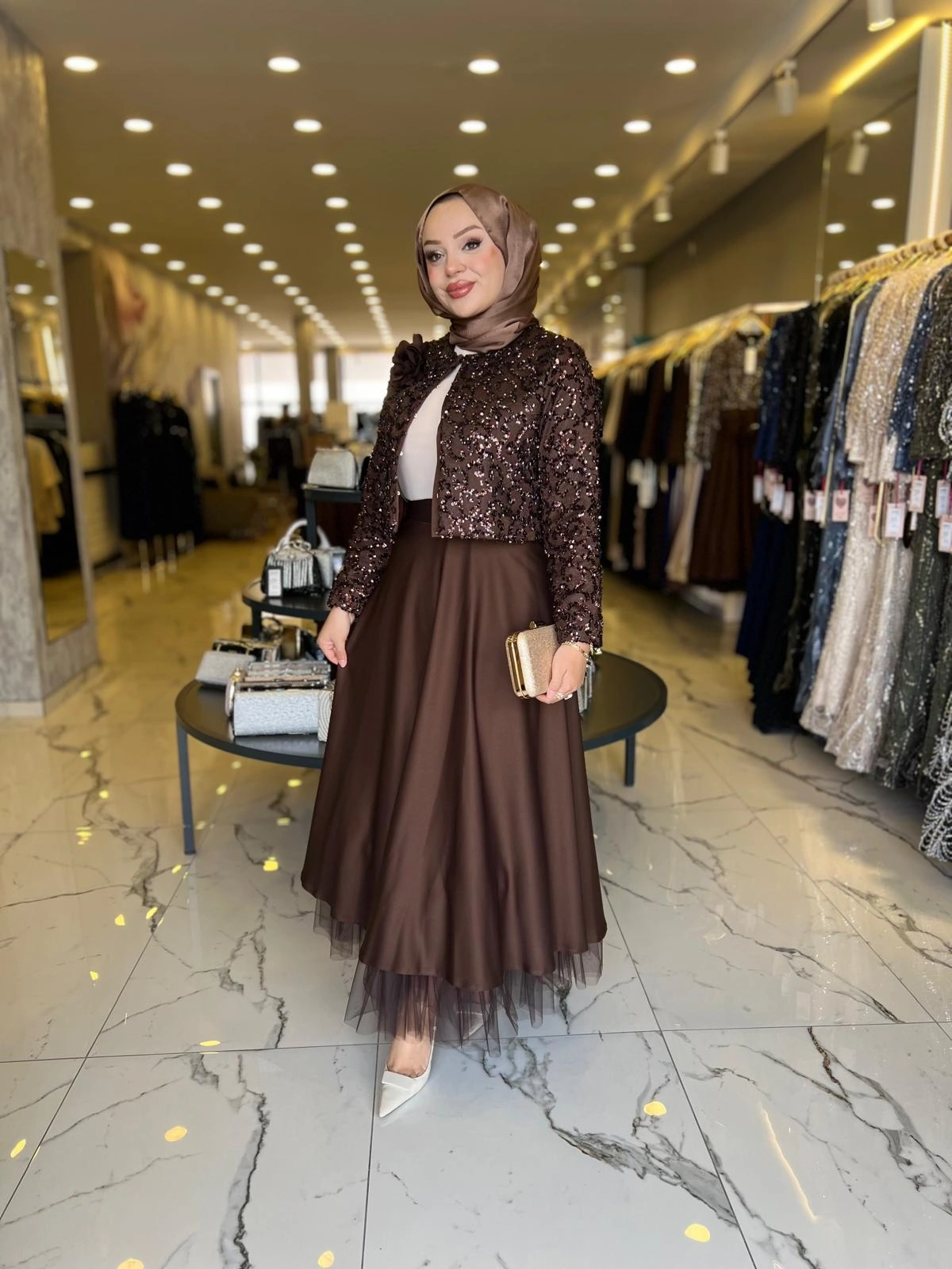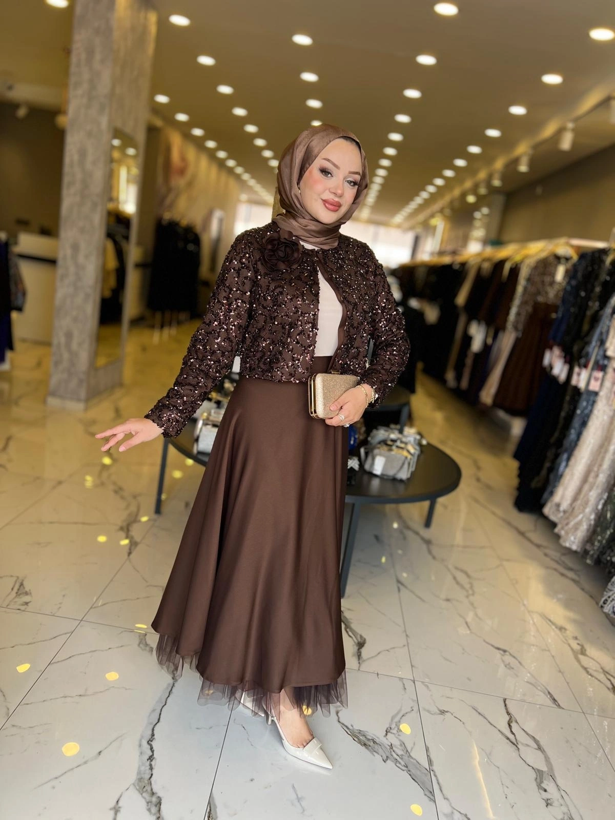 Merihce Luxury kalitesini her detayda hissedeceğiniz MATEKS-PAYETLİ CEKET ETEKLİ TAKIM KAHVE, gardırobunuzun vazgeçilmezlerinden biri olmaya aday.