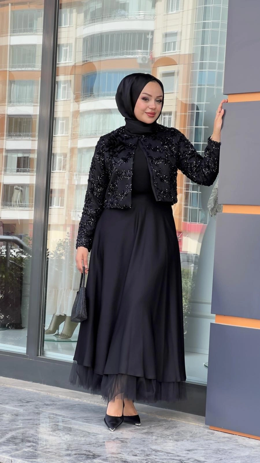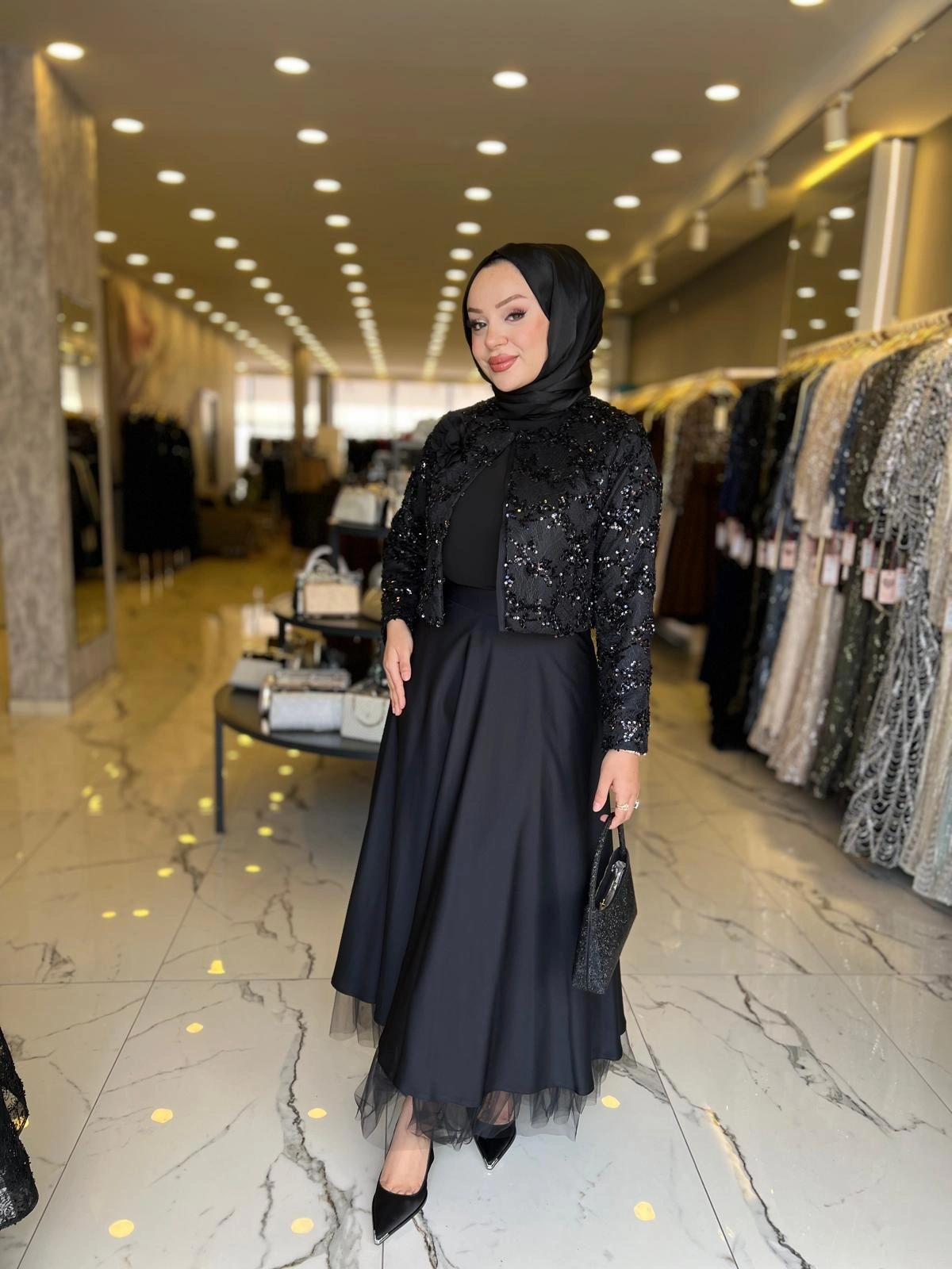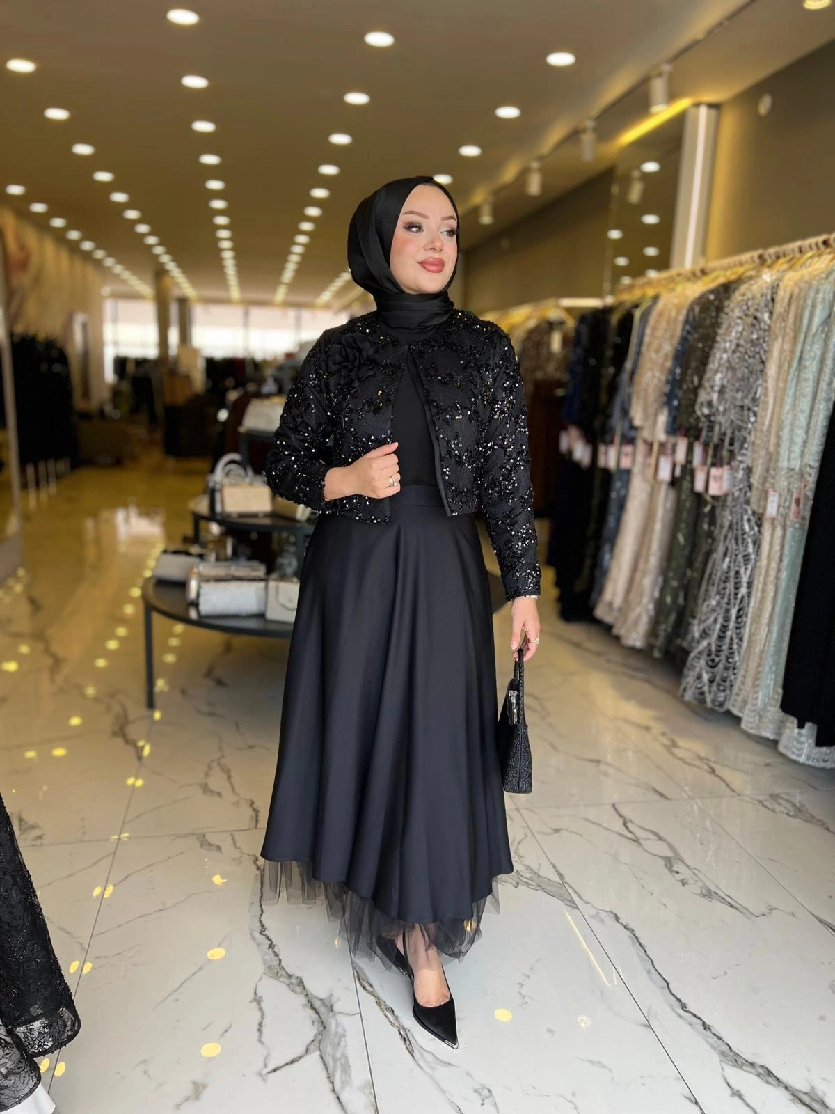 Merihce Luxury kalitesini her detayda hissedeceğiniz MATEKS-PAYETLİ CEKET ETEKLİ TAKIM SİYAH, gardırobunuzun vazgeçilmezlerinden biri olmaya aday.