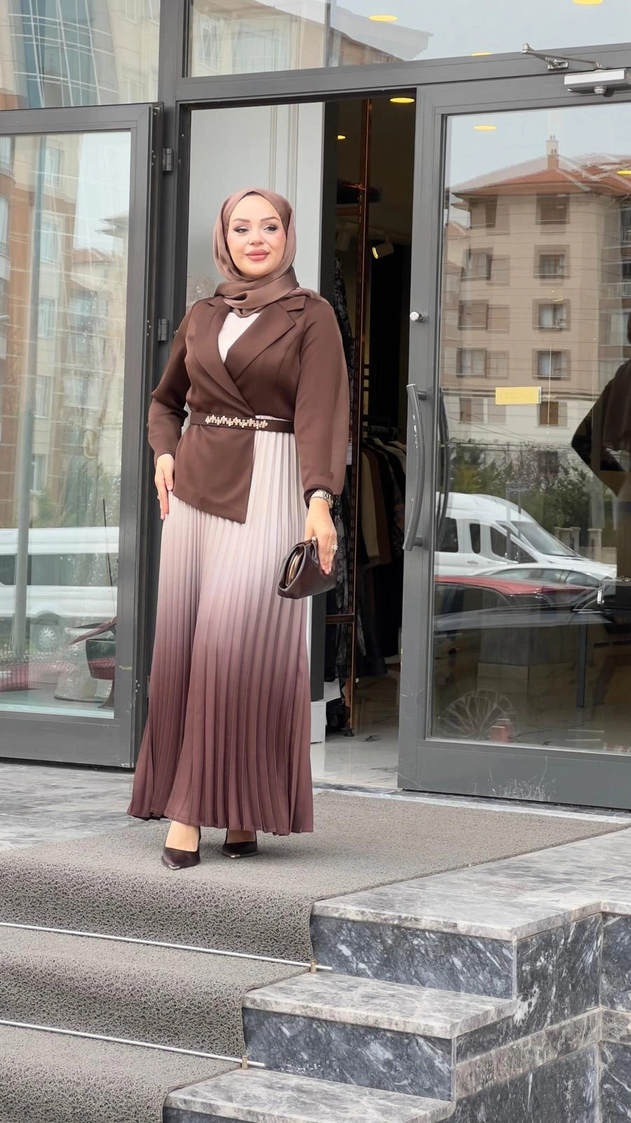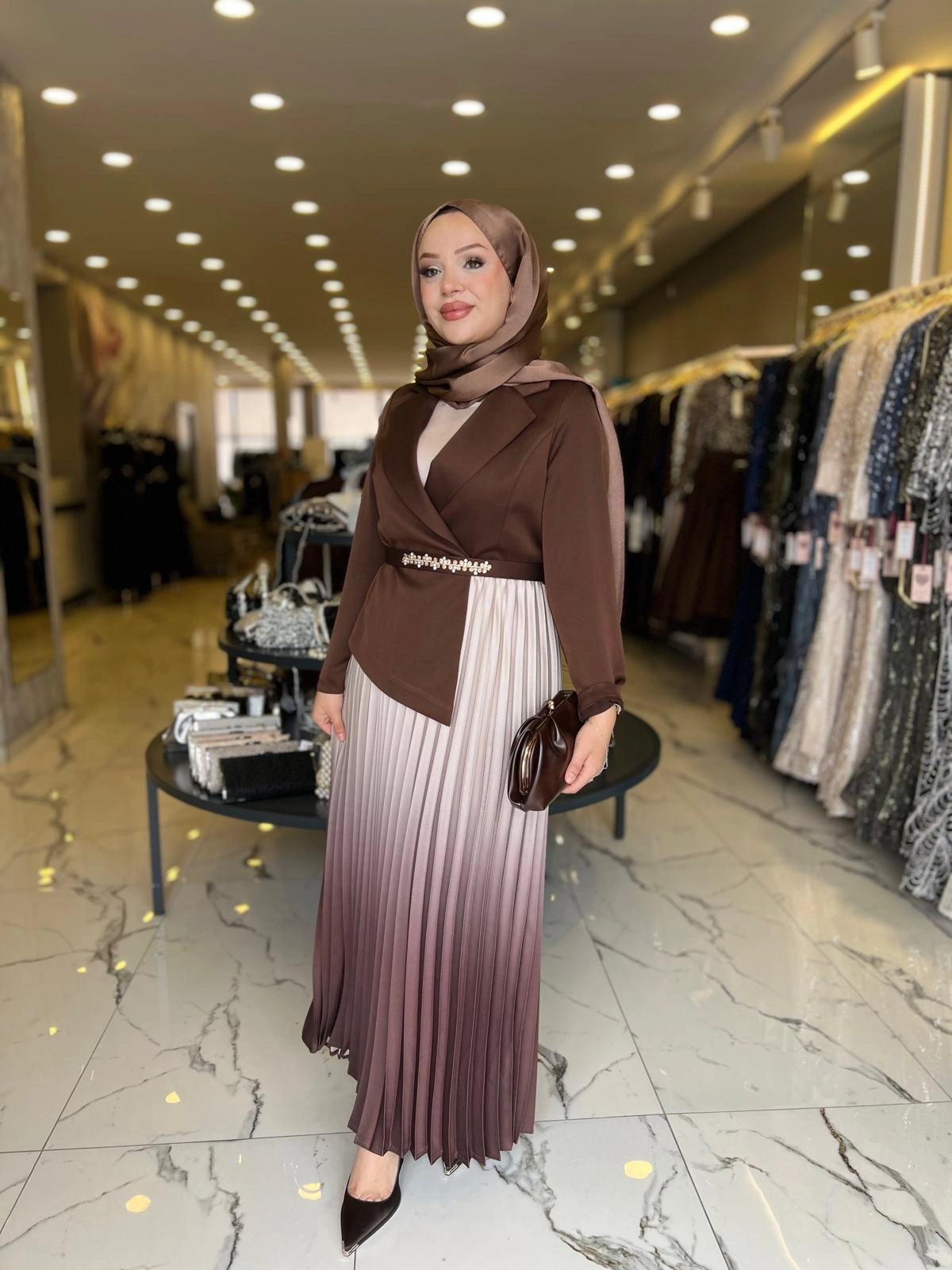 Merihce Luxury kalitesini her detayda hissedeceğiniz MATEKS-PLİSELİ ELBİSE KAHVE, gardırobunuzun vazgeçilmezlerinden biri olmaya aday.