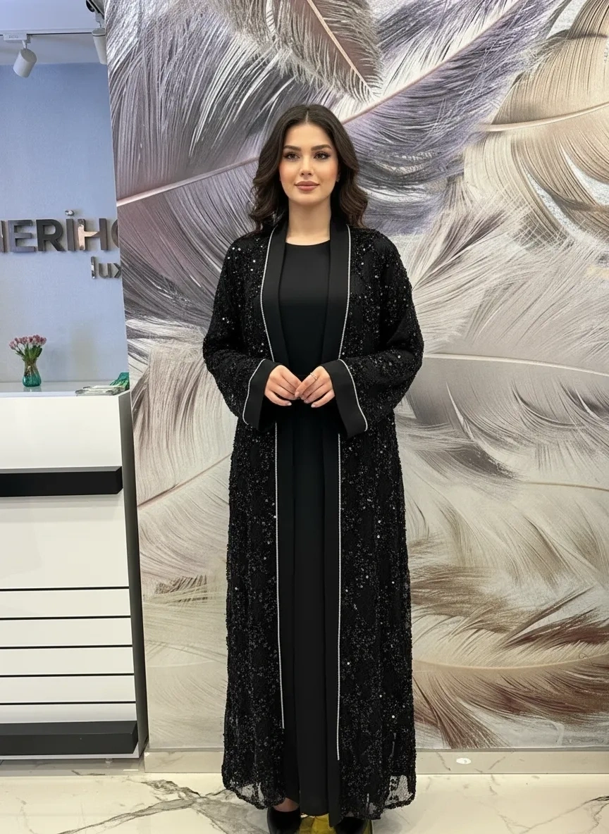 Merihce Luxury kalitesini her detayda hissedeceğiniz MATEKS-PUL DETAY ABAYA ELBİSE SİYAH, gardırobunuzun vazgeçilmezlerinden biri olmaya aday.