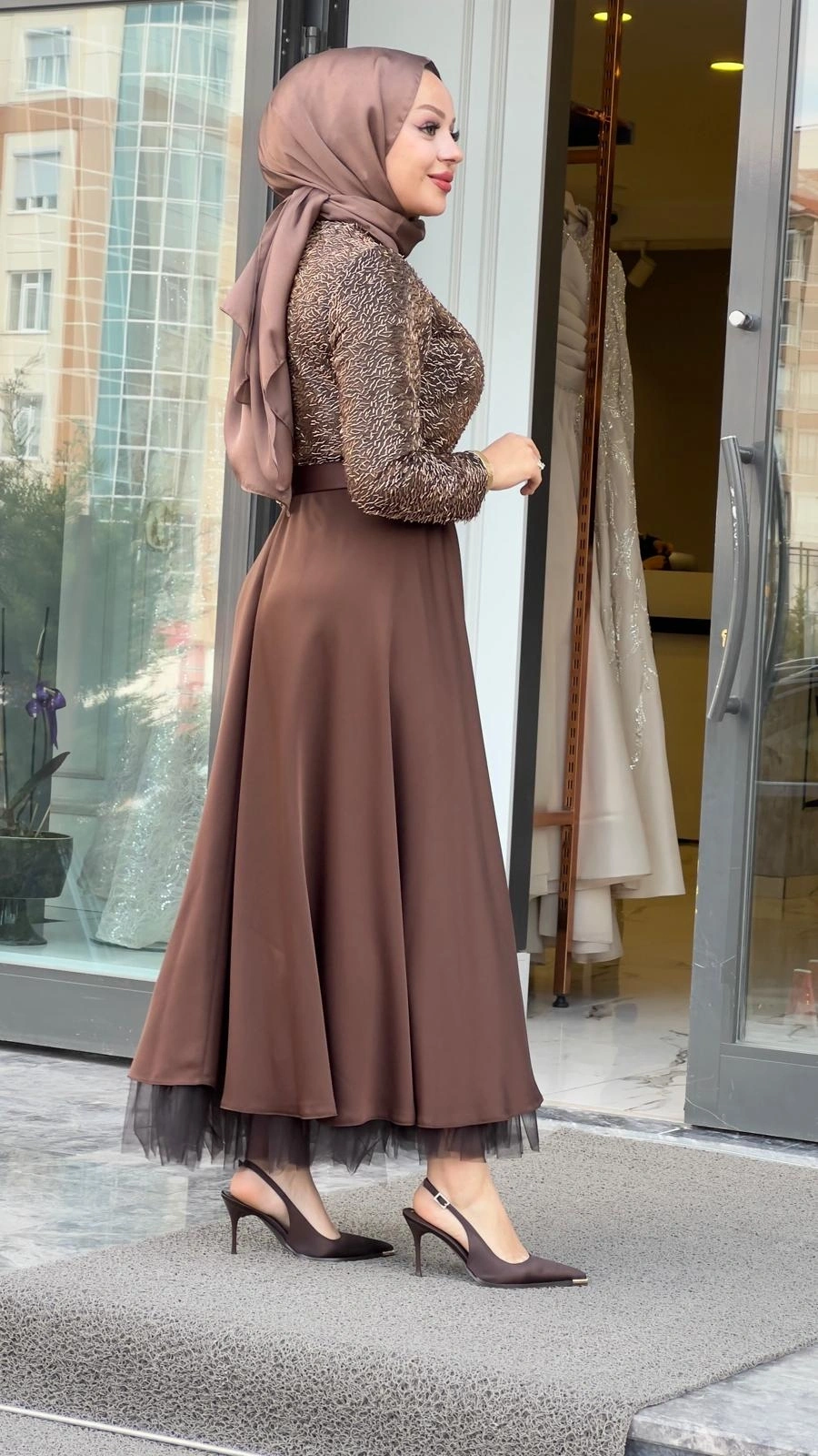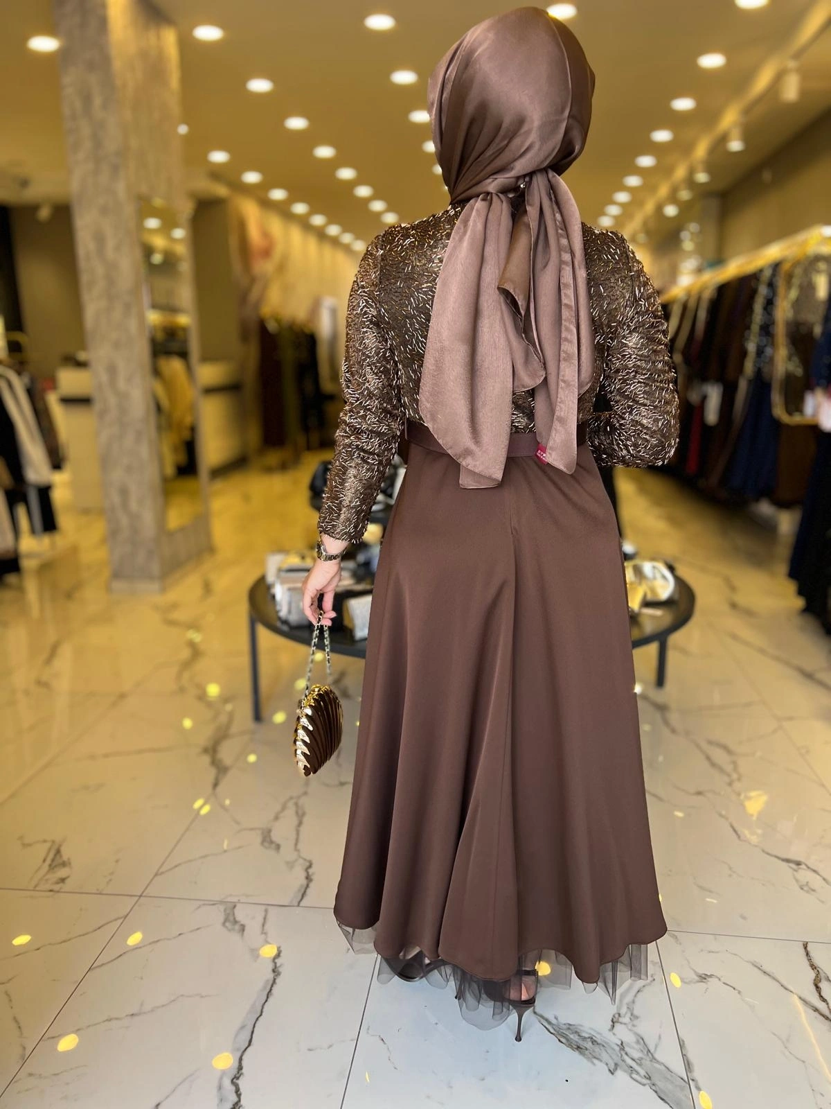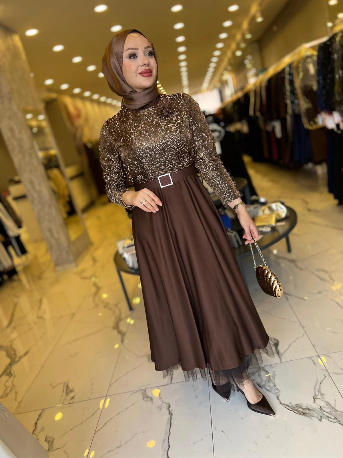 Merihce Luxury kalitesini her detayda hissedeceğiniz MATEKS-PUL PAYETLİ ELBİSE KAHVE, gardırobunuzun vazgeçilmezlerinden biri olmaya aday.