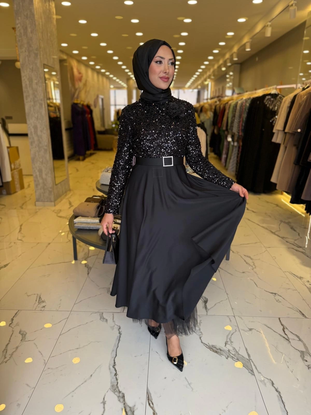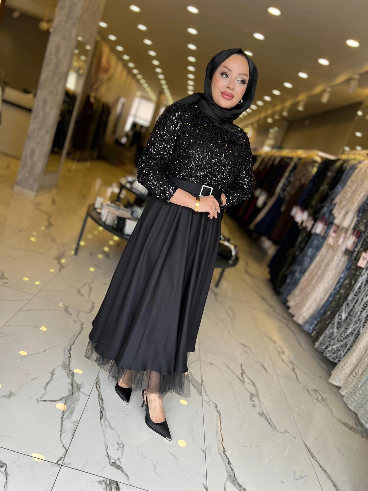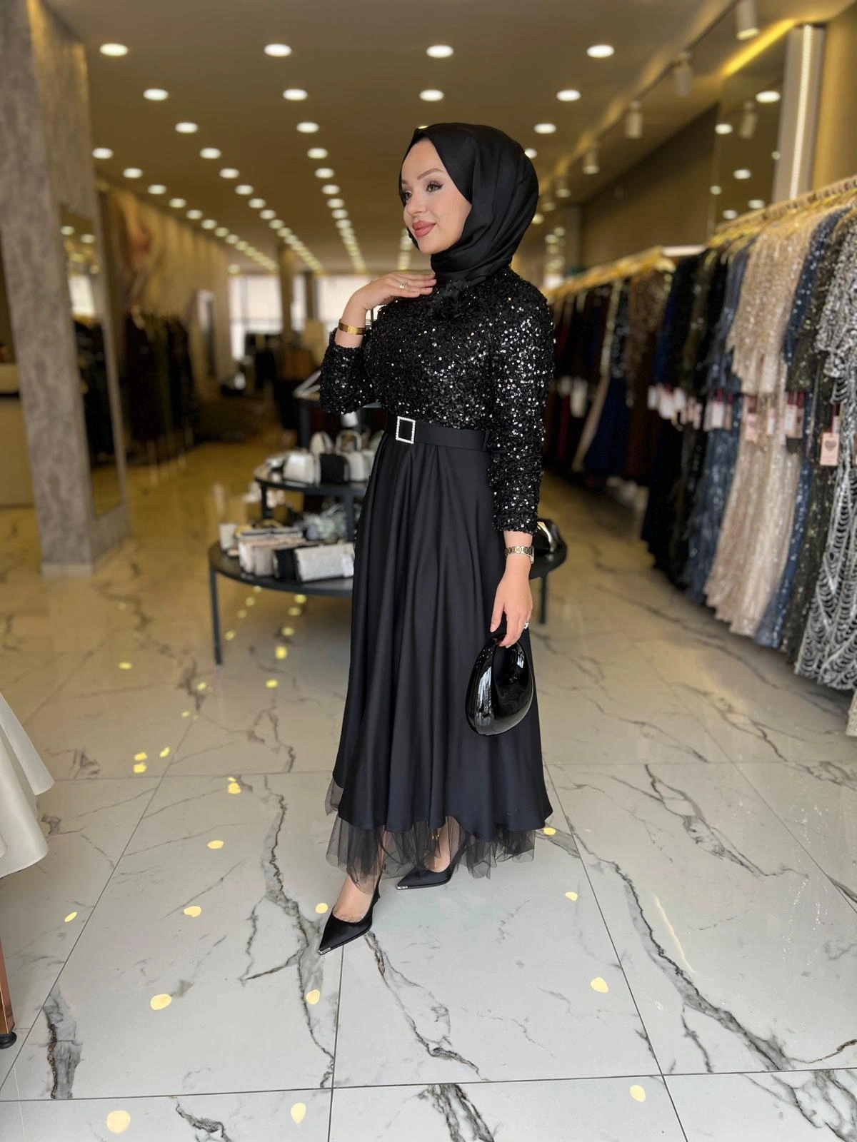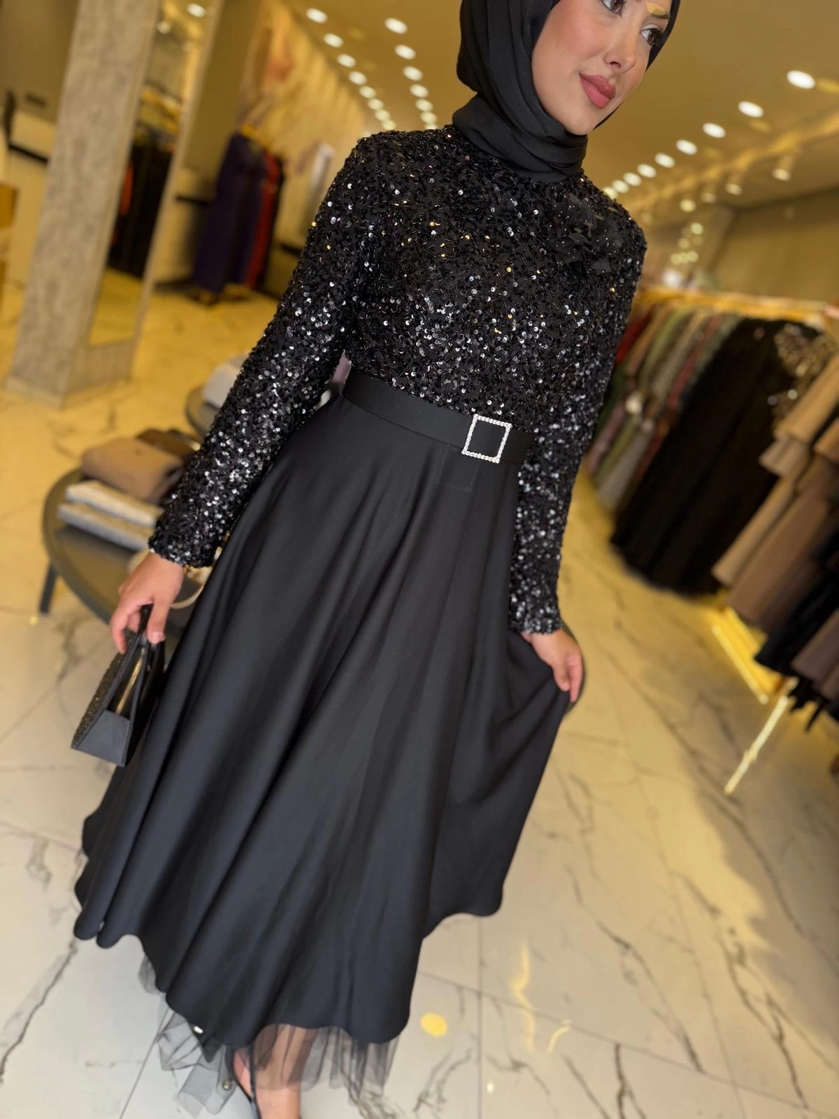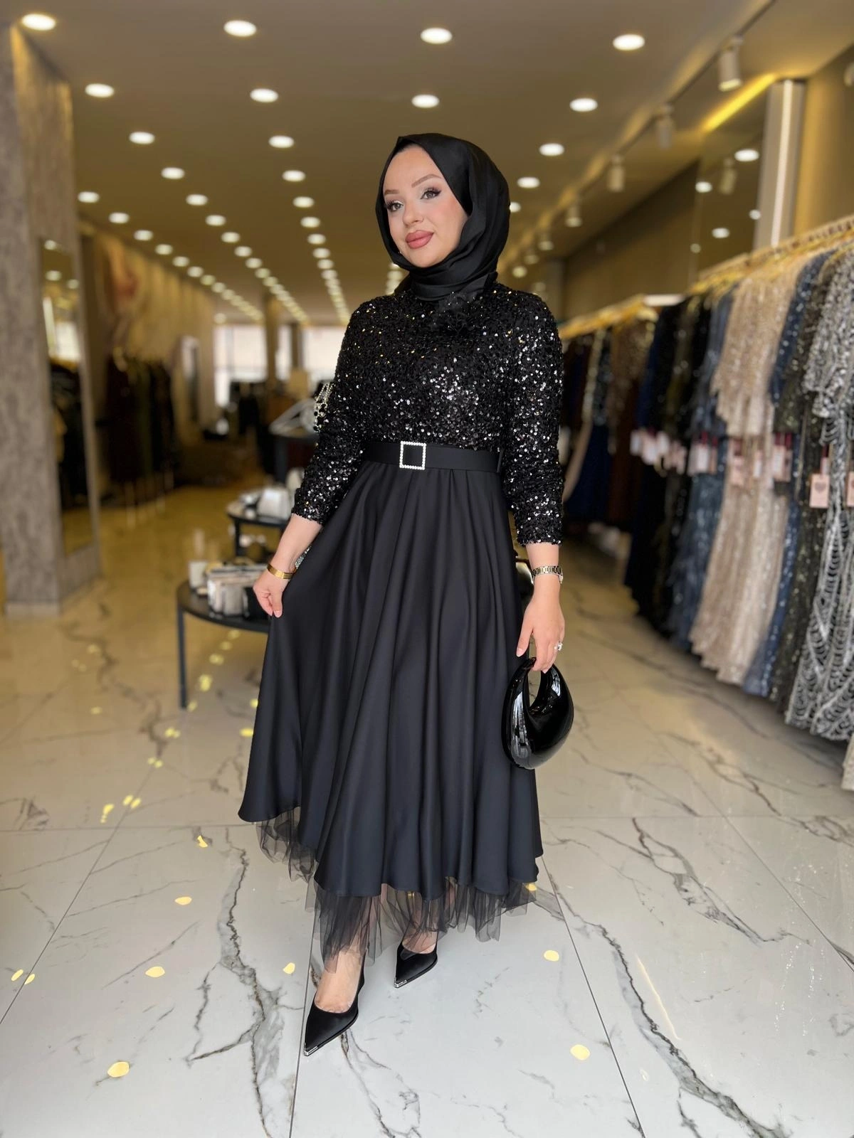 Merihce Luxury kalitesini her detayda hissedeceğiniz MATEKS-PUL PAYETLİ ELBİSE SİYAH, gardırobunuzun vazgeçilmezlerinden biri olmaya aday.