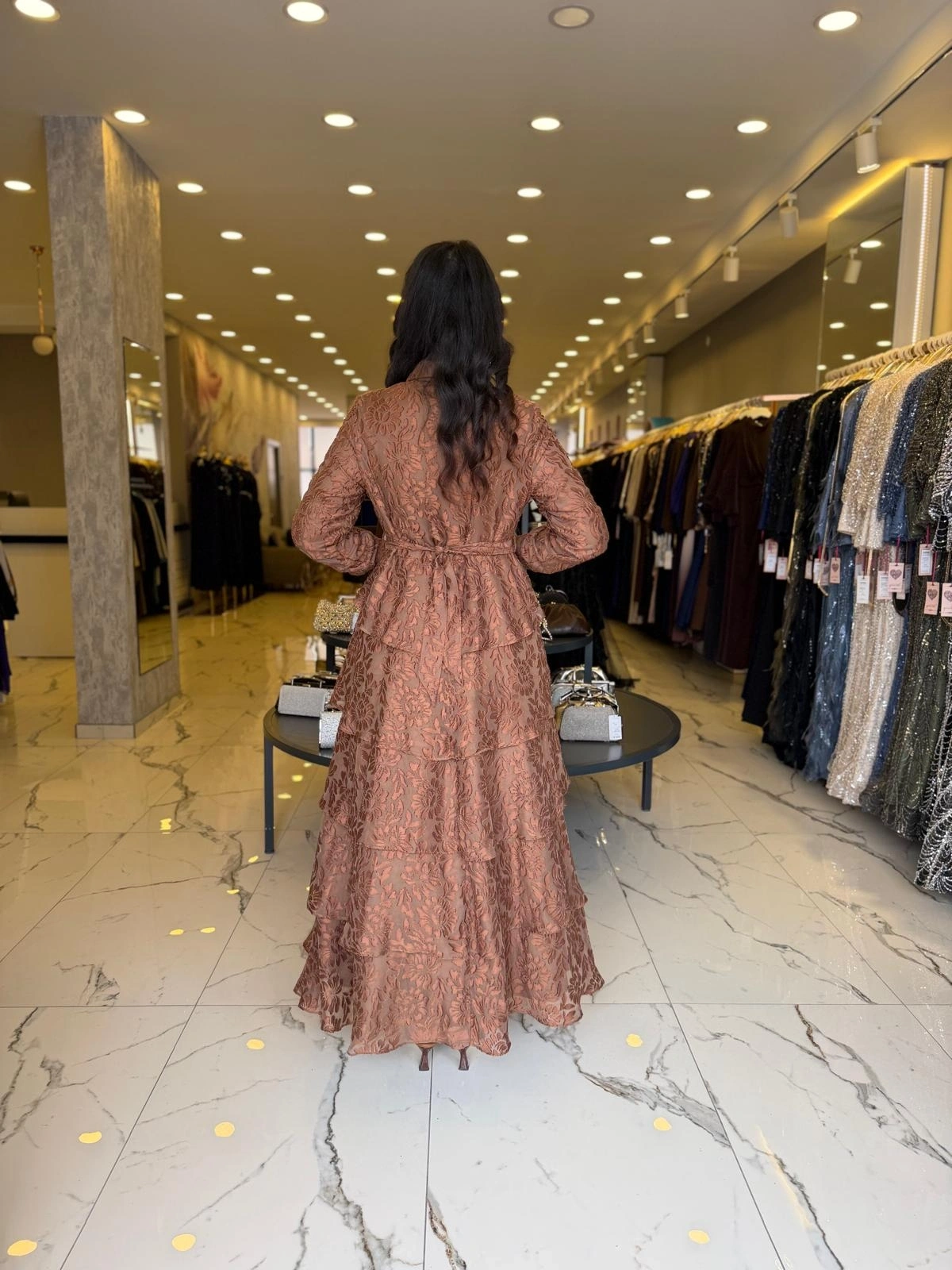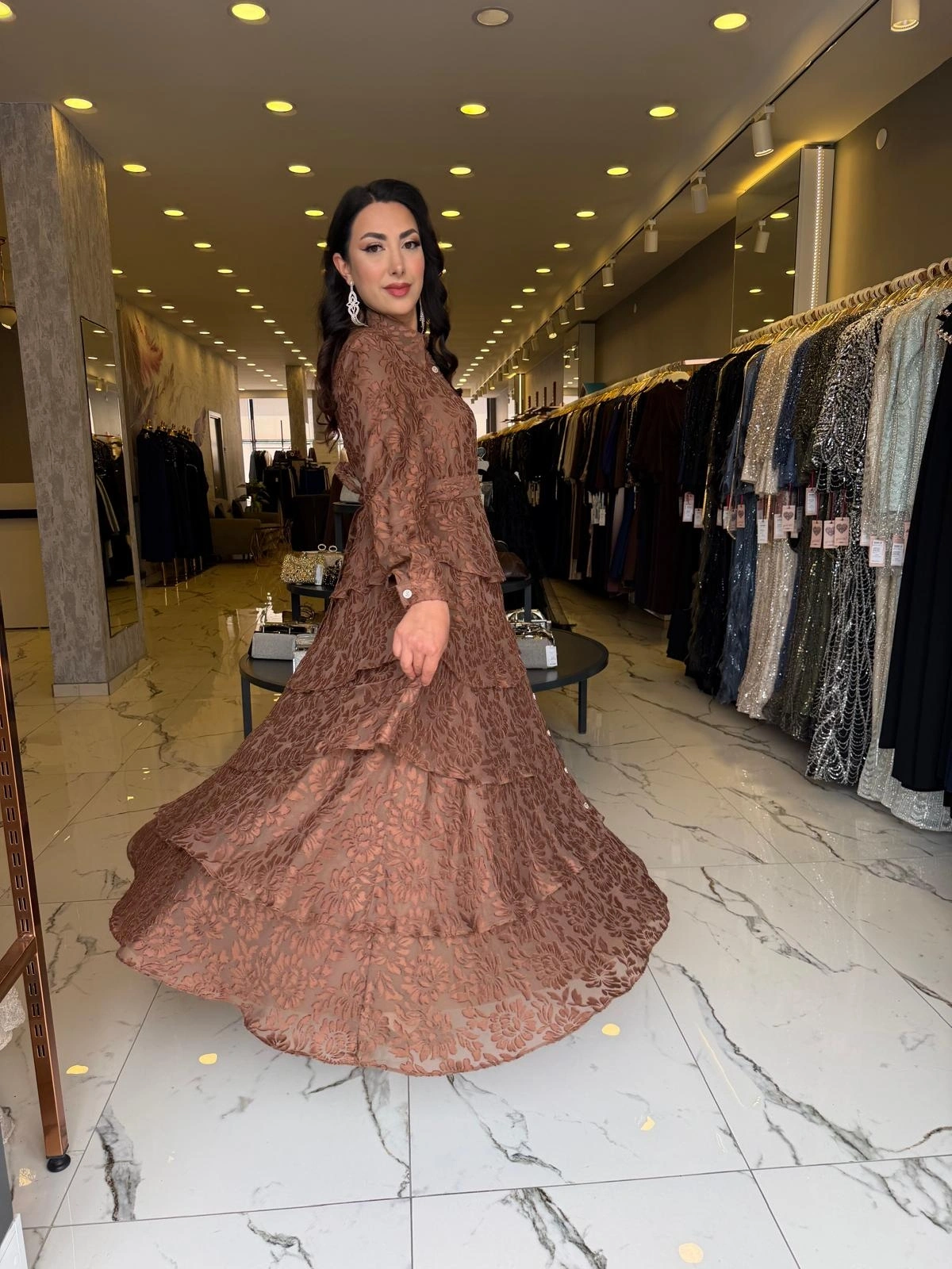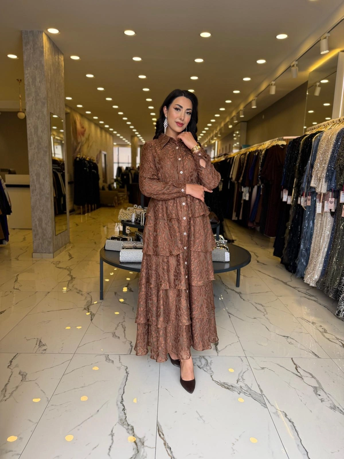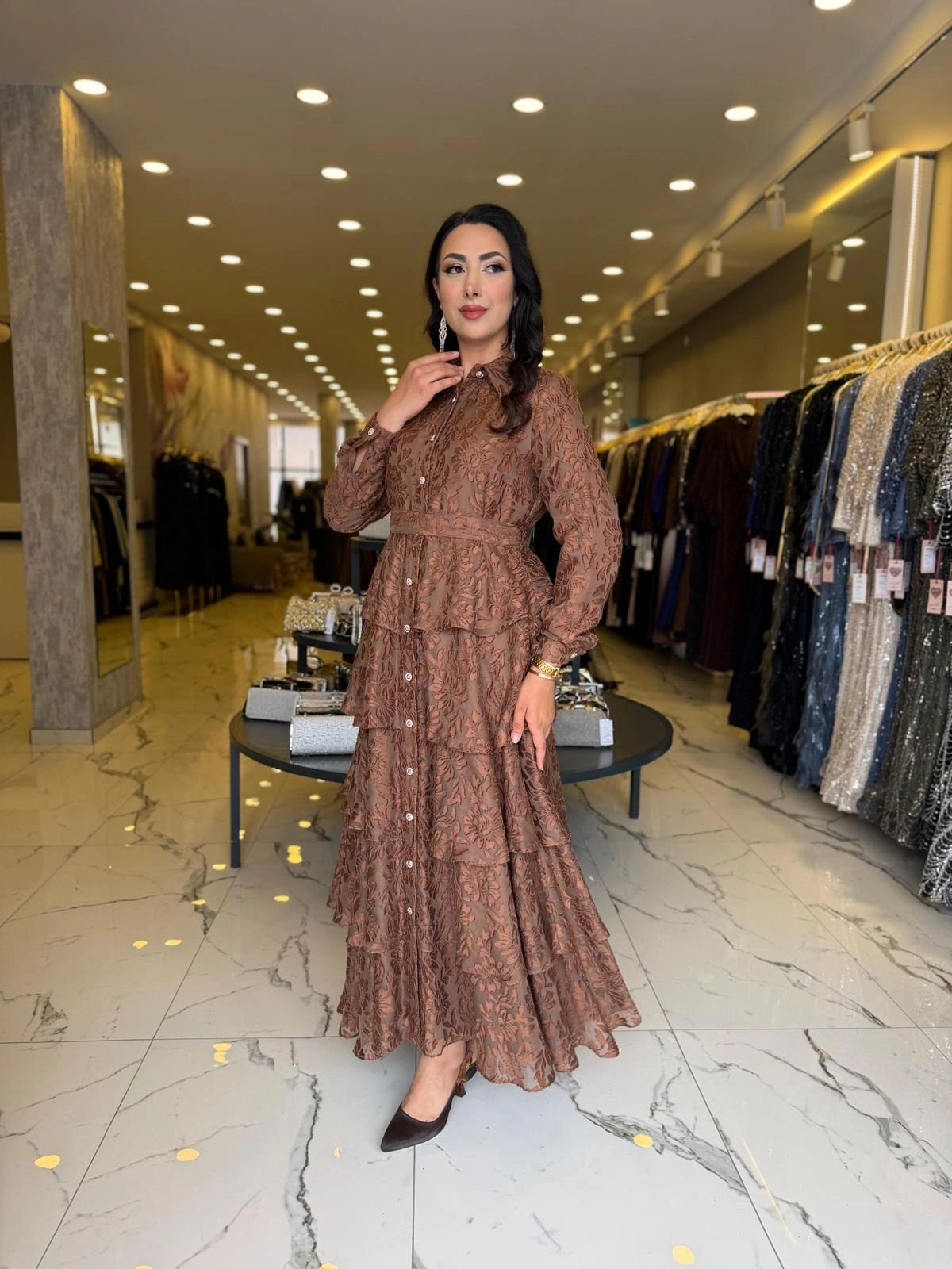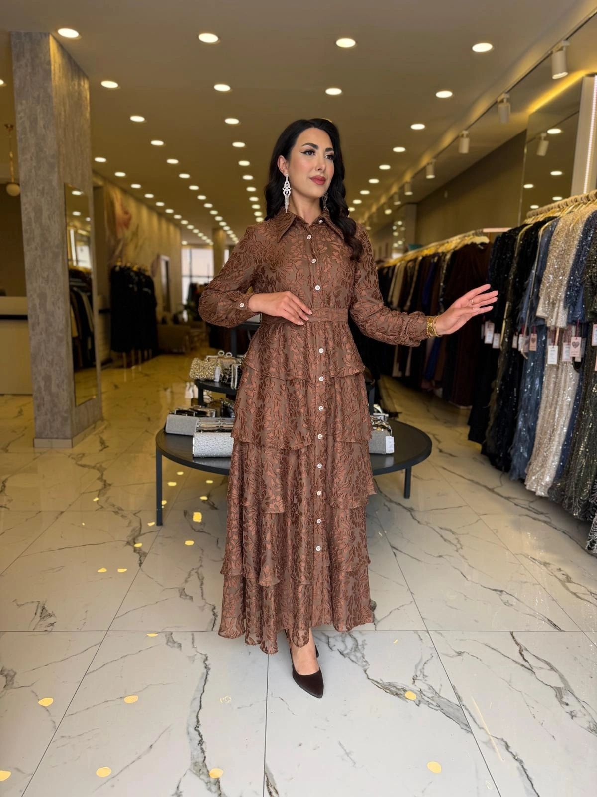 Merihce Luxury kalitesini her detayda hissedeceğiniz MATEKS-YAKMA ELBİSE KAHVE, gardırobunuzun vazgeçilmezlerinden biri olmaya aday.