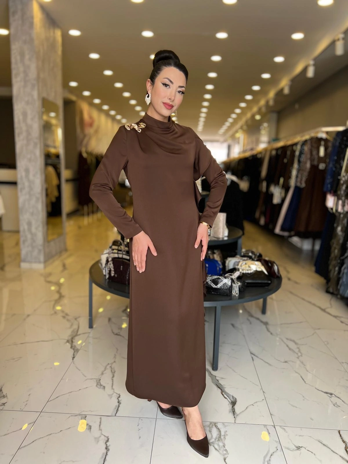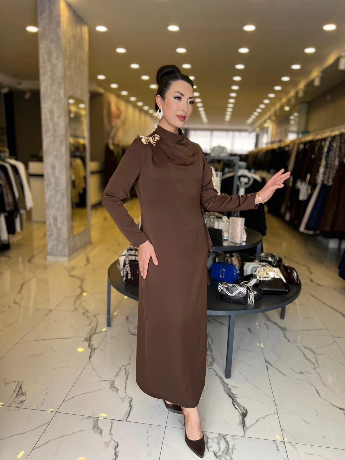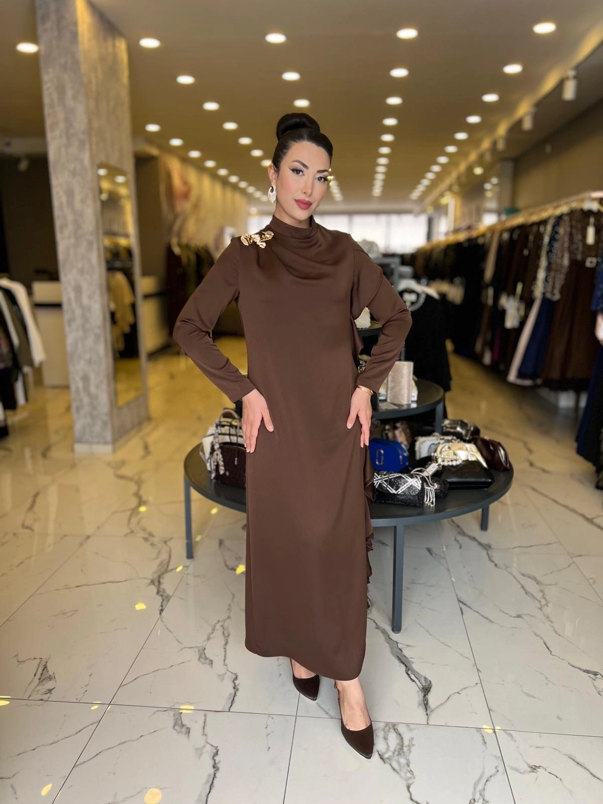 MATEKS-YANI FIRFIRLI ELBİSE KAHVE ile Merihce Luxury'nin zarafet ve kalite anlayışını keşfedin. Koleksiyonumuzun bu seçkin parçası, stilinize lüks bir dokunuş katmak için özenle tasarlandı.