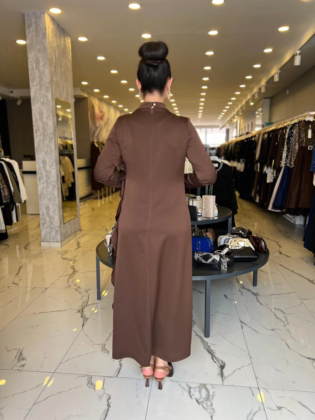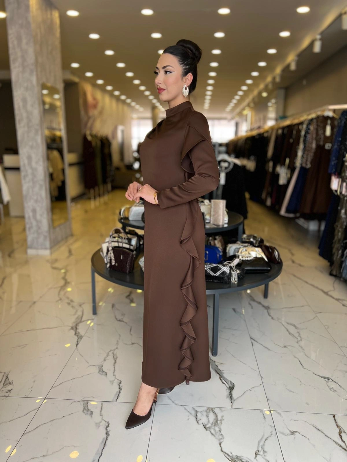 Merihce Luxury kalitesini her detayda hissedeceğiniz MATEKS-YANI FIRFIRLI ELBİSE KAHVE, gardırobunuzun vazgeçilmezlerinden biri olmaya aday.