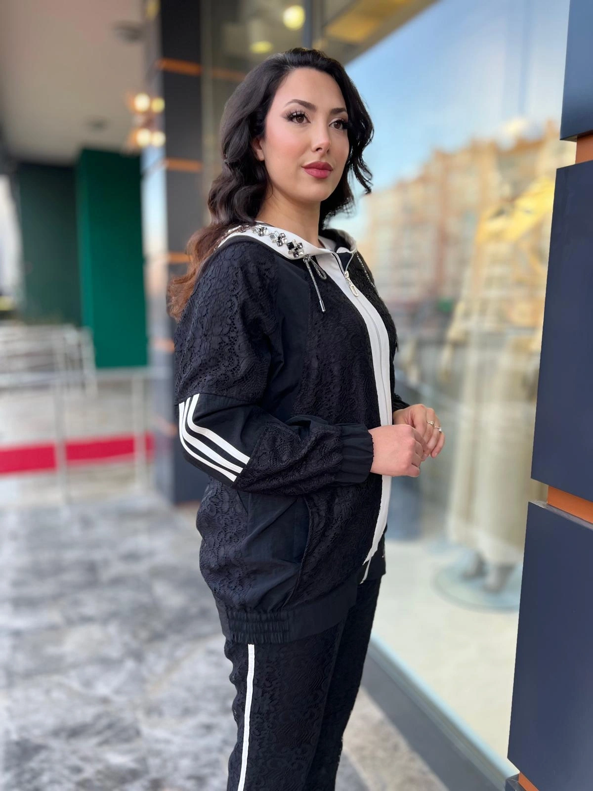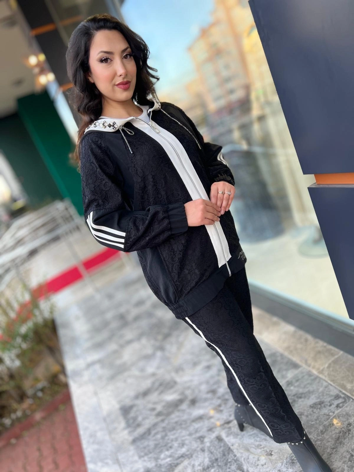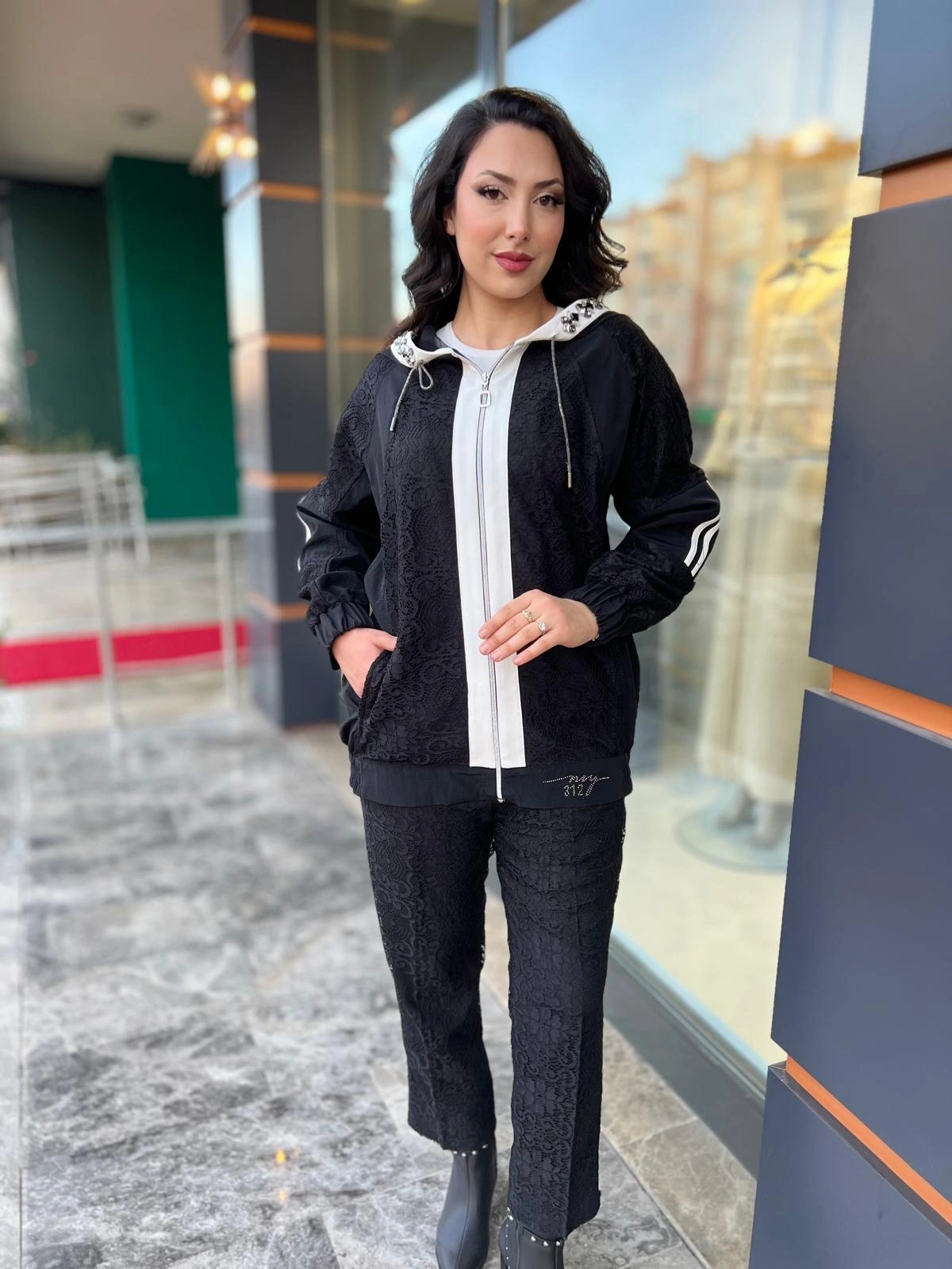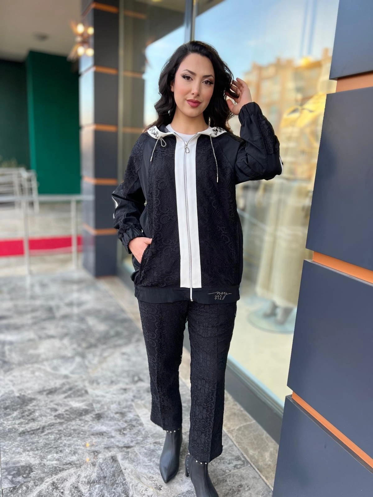 Merihce Luxury kalitesini her detayda hissedeceğiniz MY312-KAPŞONU TAŞLI DANTELLİ TAKIM SİYAH, gardırobunuzun vazgeçilmezlerinden biri olmaya aday.