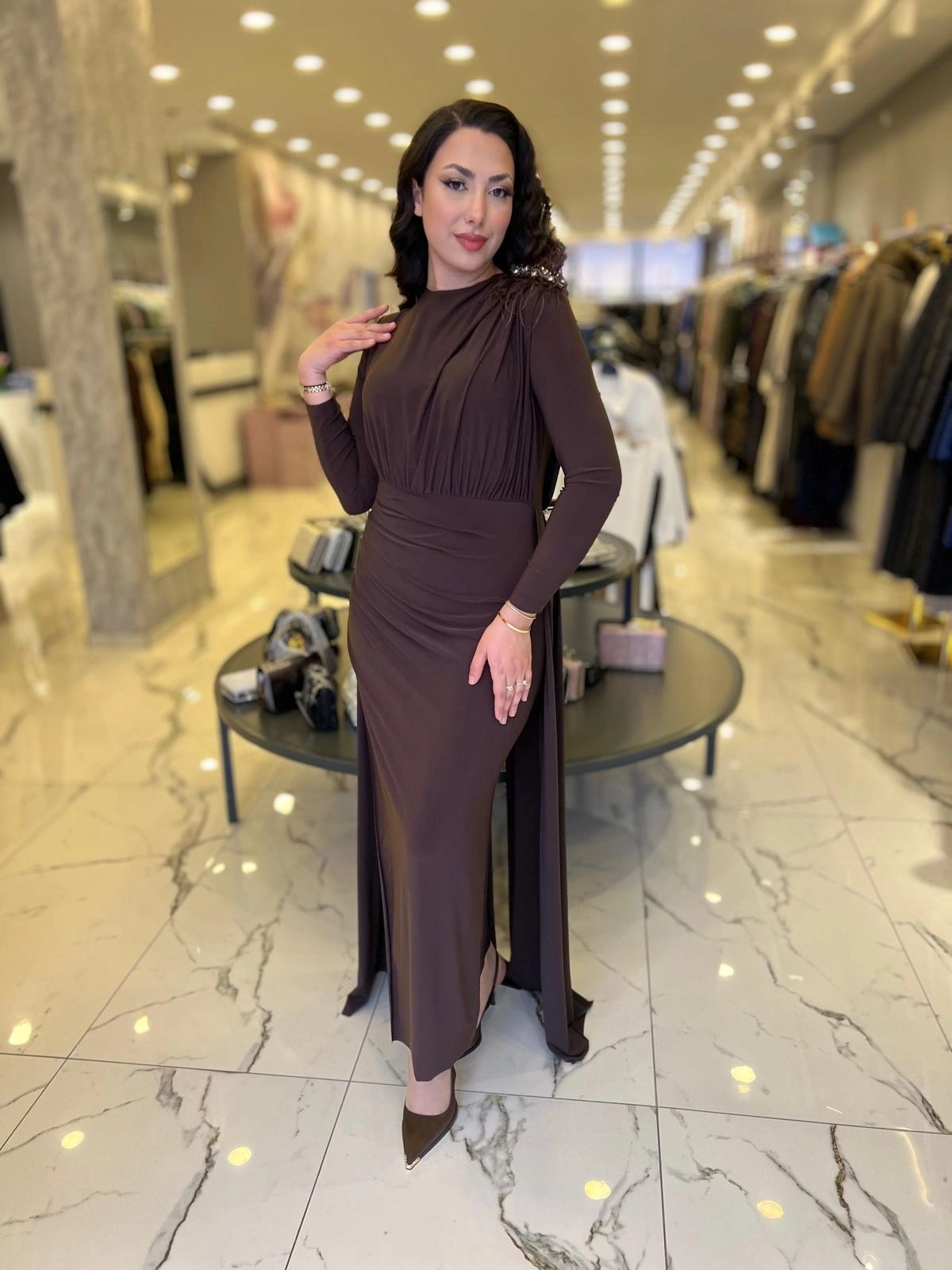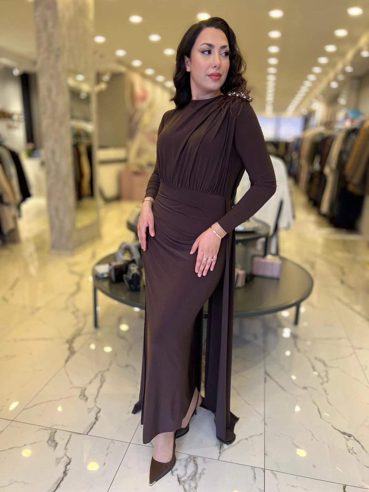 Merihce Luxury kalitesini her detayda hissedeceğiniz MY312-OMZU AKSESUARLI ELBİSE KAHVE, gardırobunuzun vazgeçilmezlerinden biri olmaya aday.