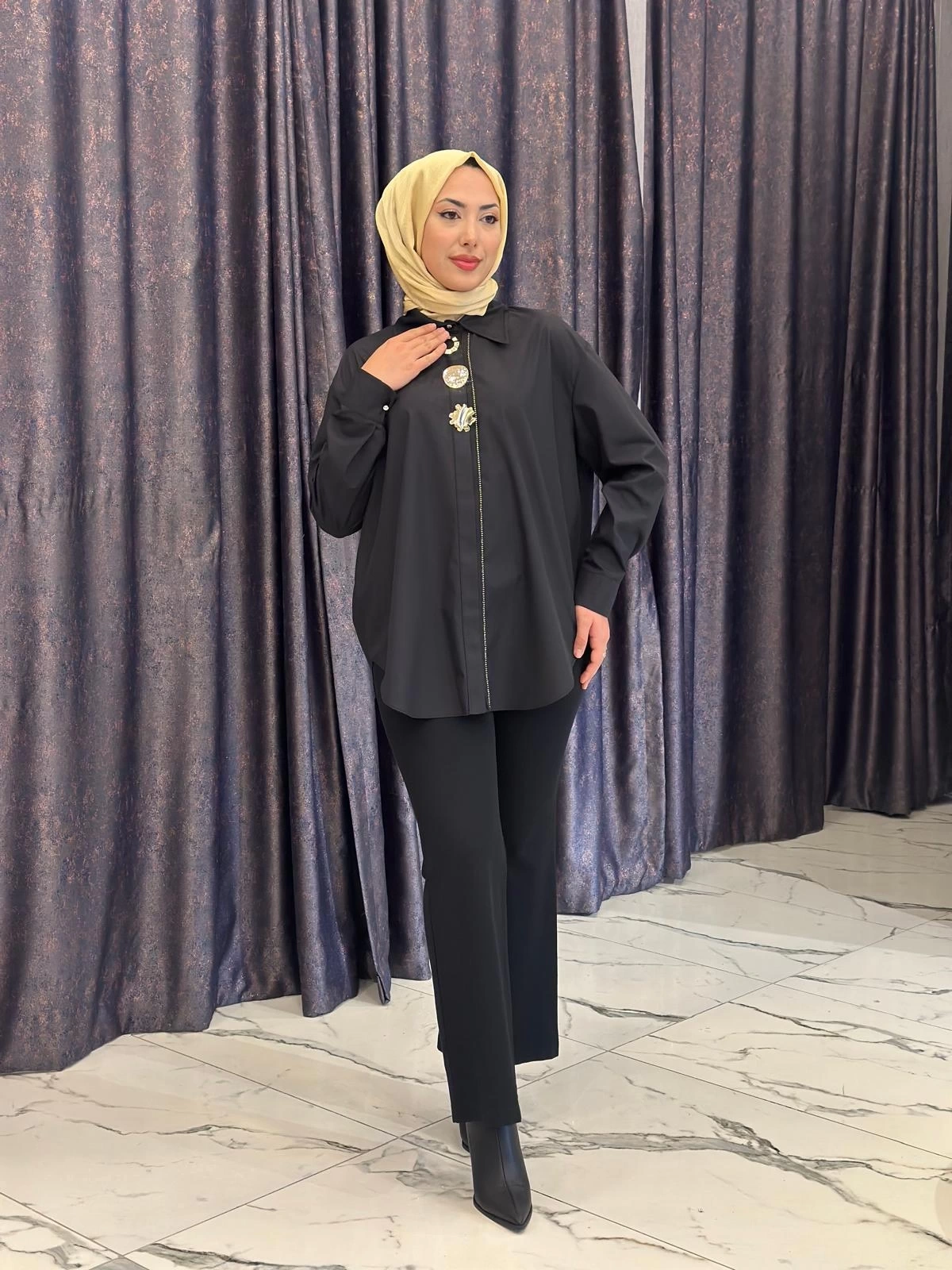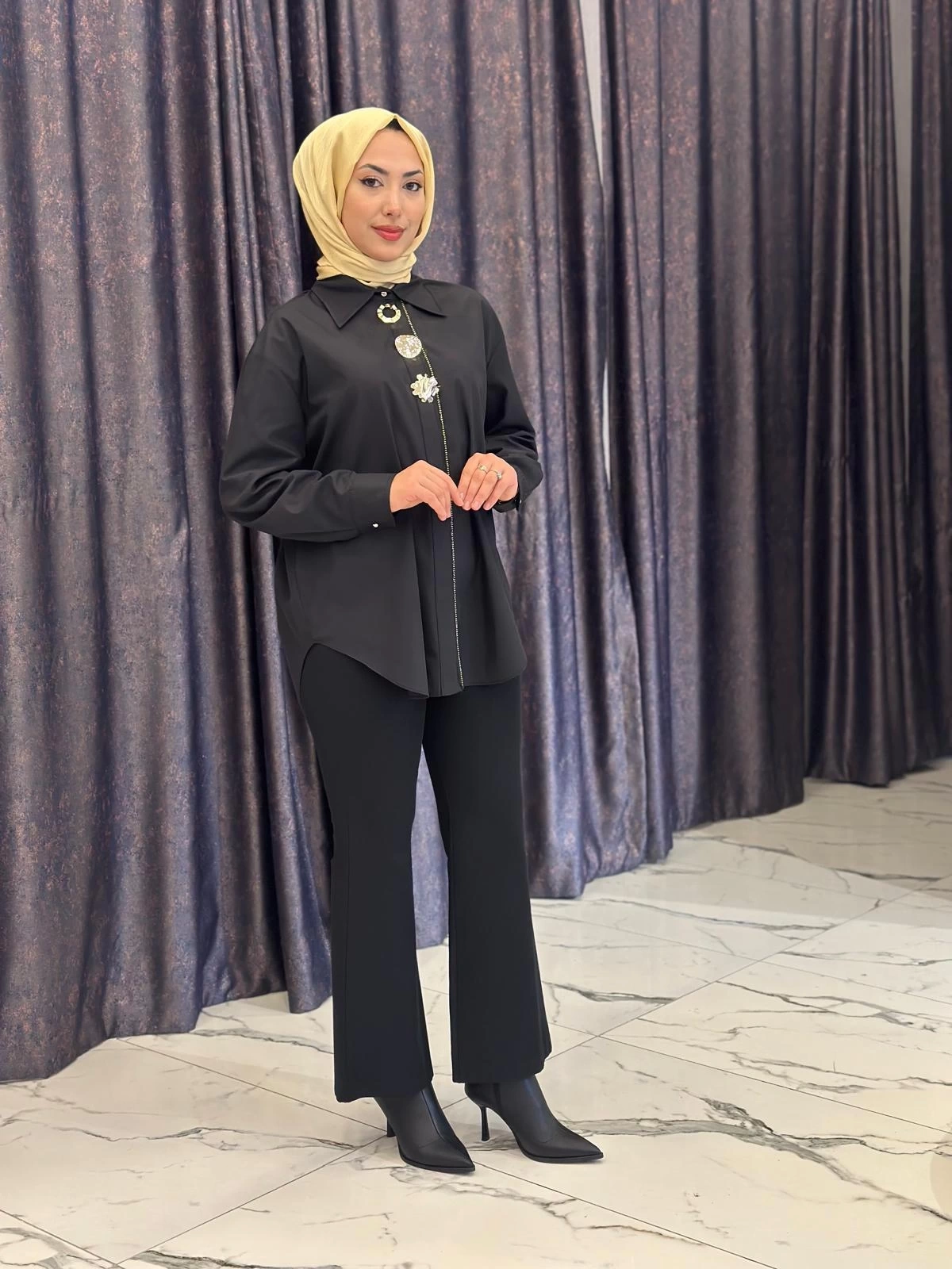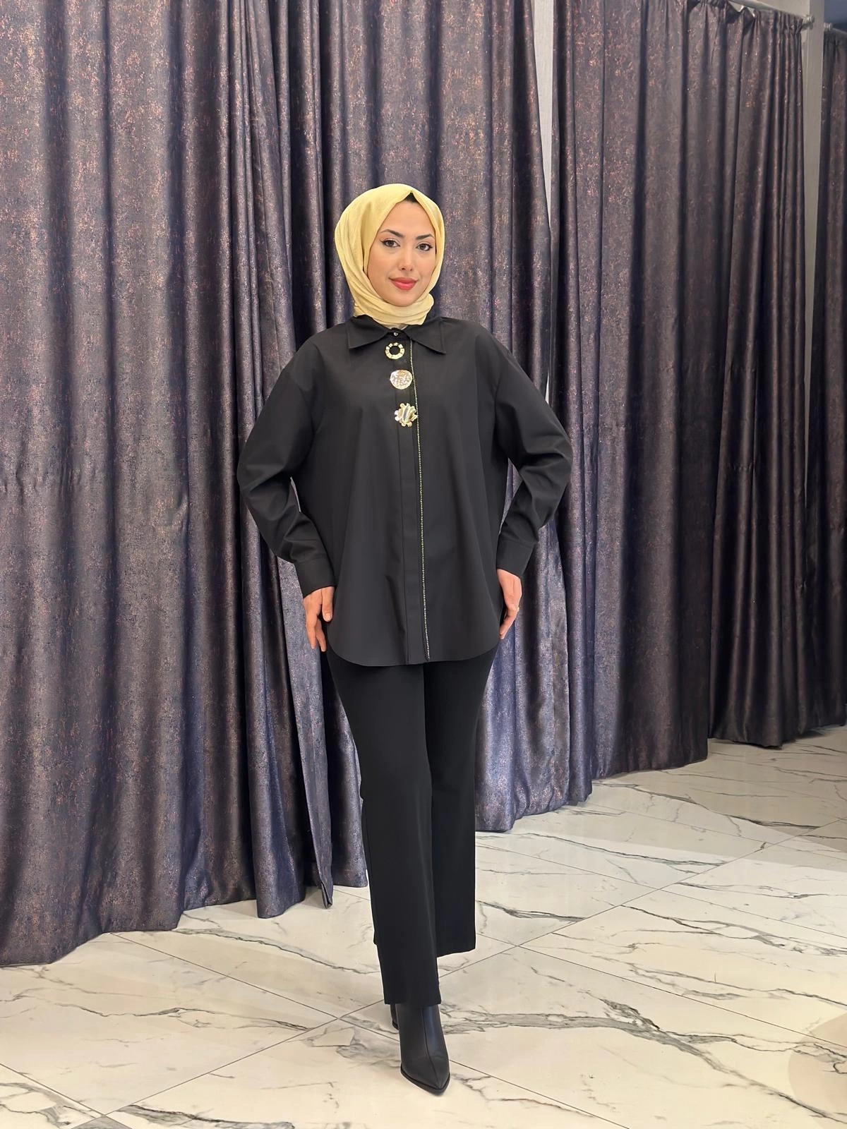 Merihce Luxury kalitesini her detayda hissedeceğiniz MY312-ÖN AKSESUARLI GÖMLEK SİYAH, gardırobunuzun vazgeçilmezlerinden biri olmaya aday.
