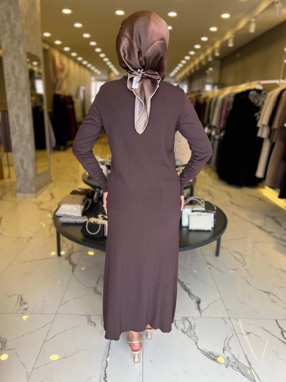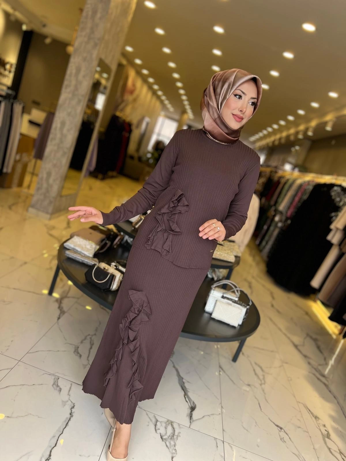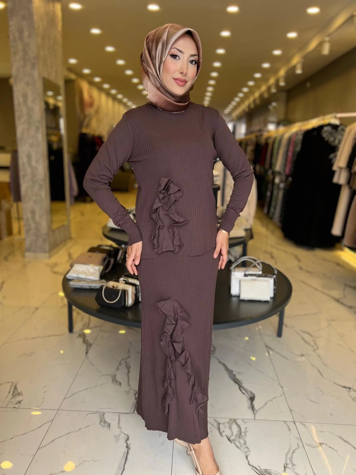 Merihce Luxury kalitesini her detayda hissedeceğiniz NİLİWİ-FIRFIRLI ETEKLİ TAKIM KAHVE, gardırobunuzun vazgeçilmezlerinden biri olmaya aday.