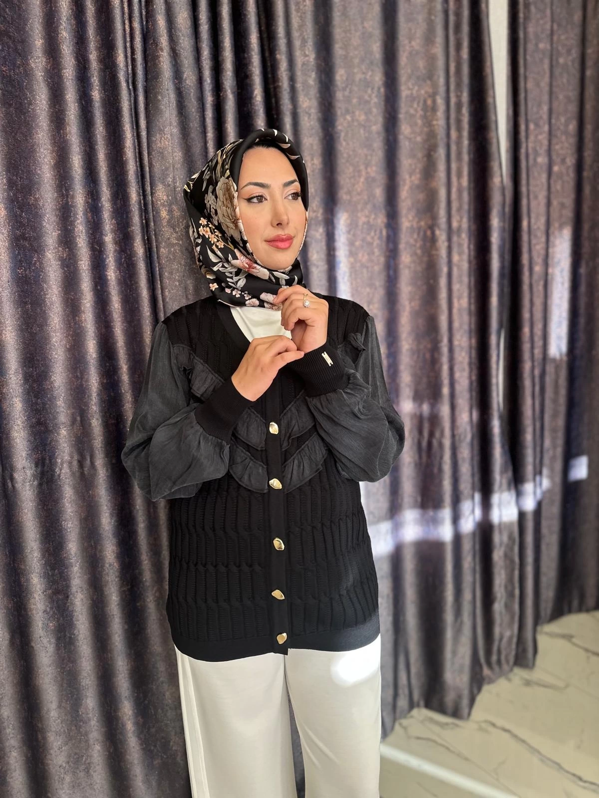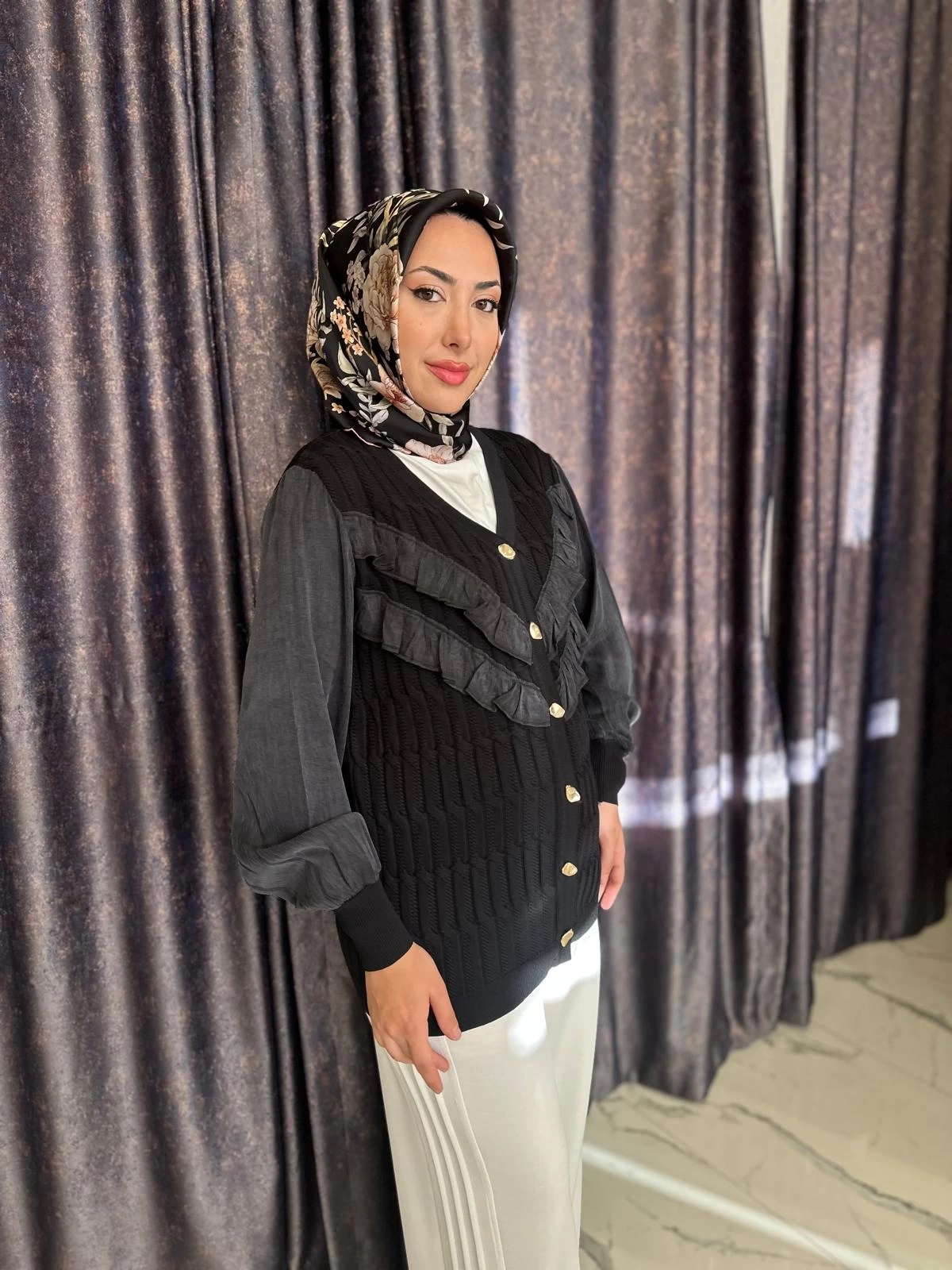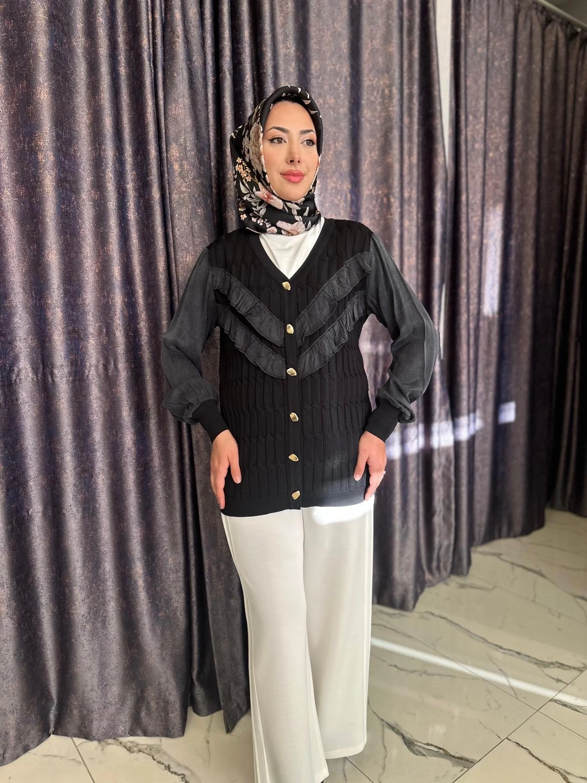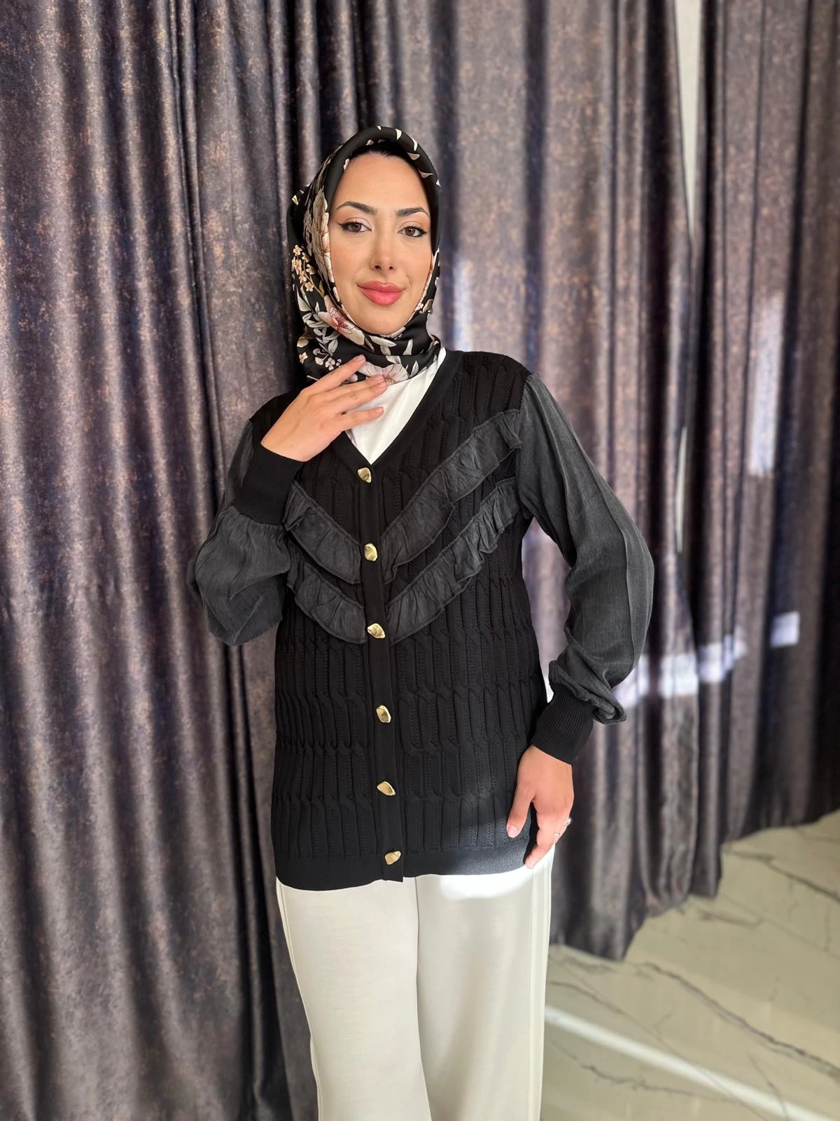 Merihce Luxury kalitesini her detayda hissedeceğiniz NİLİWİ-V YAKA FIRFIRLI HIRKA SİYAH, gardırobunuzun vazgeçilmezlerinden biri olmaya aday.