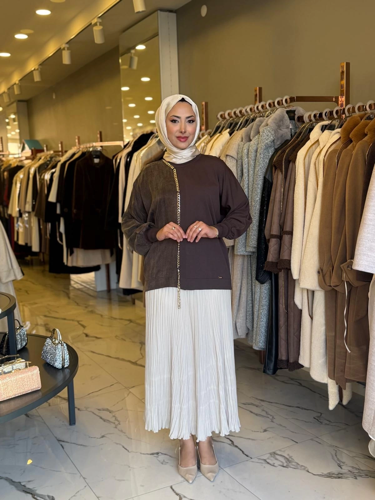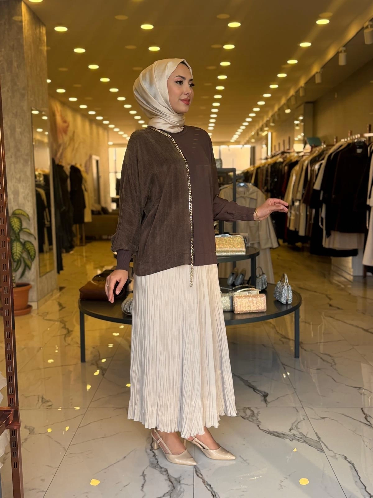 Merihce Luxury kalitesini her detayda hissedeceğiniz NİLİWİ-YARISI KUMAŞ ZİNCİRLİ YARASA BLUZ KAHVE, gardırobunuzun vazgeçilmezlerinden biri olmaya aday.