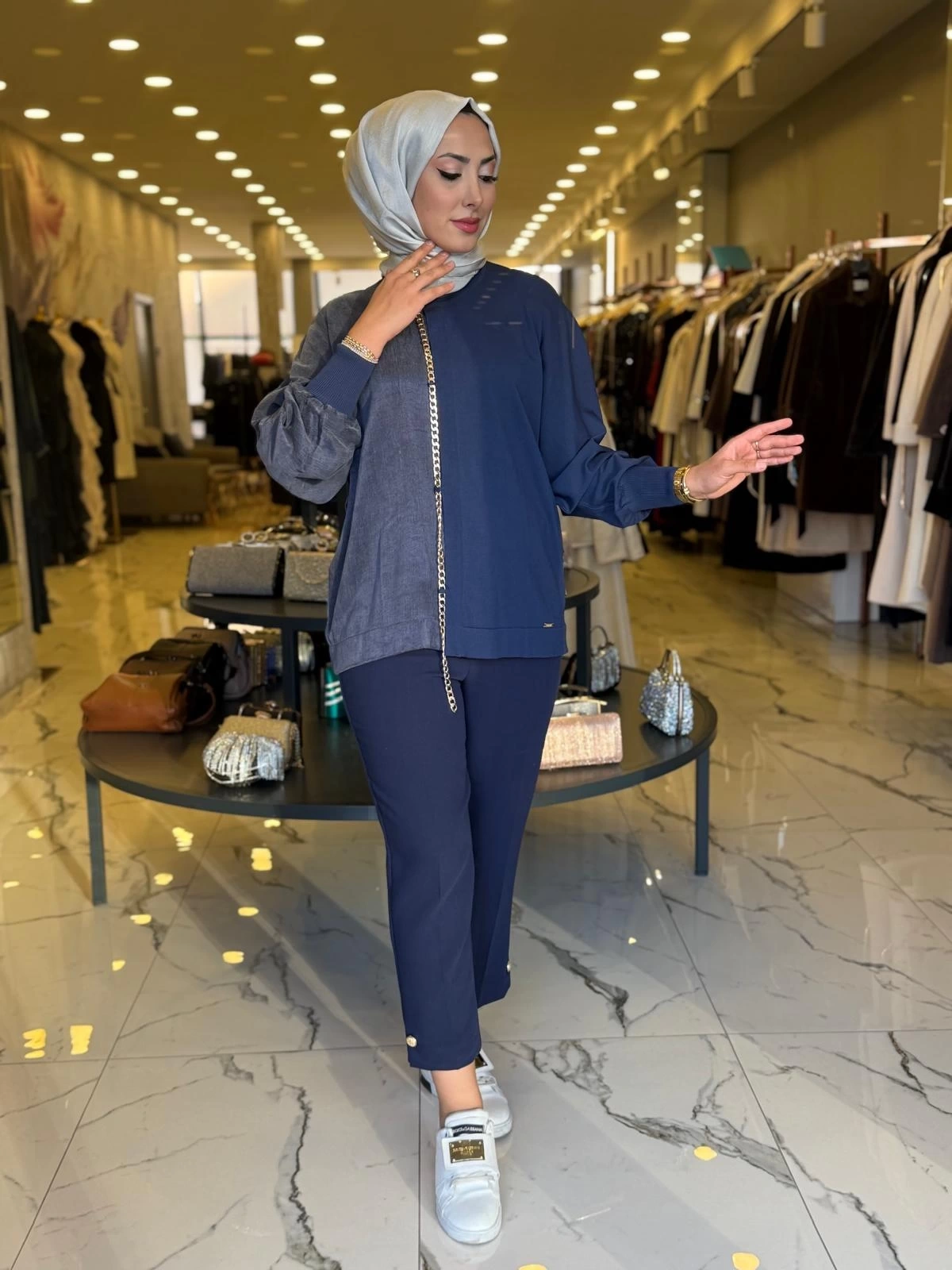 Merihce Luxury kalitesini her detayda hissedeceğiniz NİLİWİ-YARISI KUMAŞ ZİNCİRLİ YARASA BLUZ LACİVERT, gardırobunuzun vazgeçilmezlerinden biri olmaya aday.