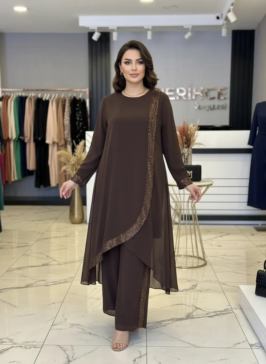 Merihce Luxury kalitesini her detayda hissedeceğiniz PERİ-BÜYÜK BEDEN PANTOLONLU TAKIM KAHVE, gardırobunuzun vazgeçilmezlerinden biri olmaya aday.