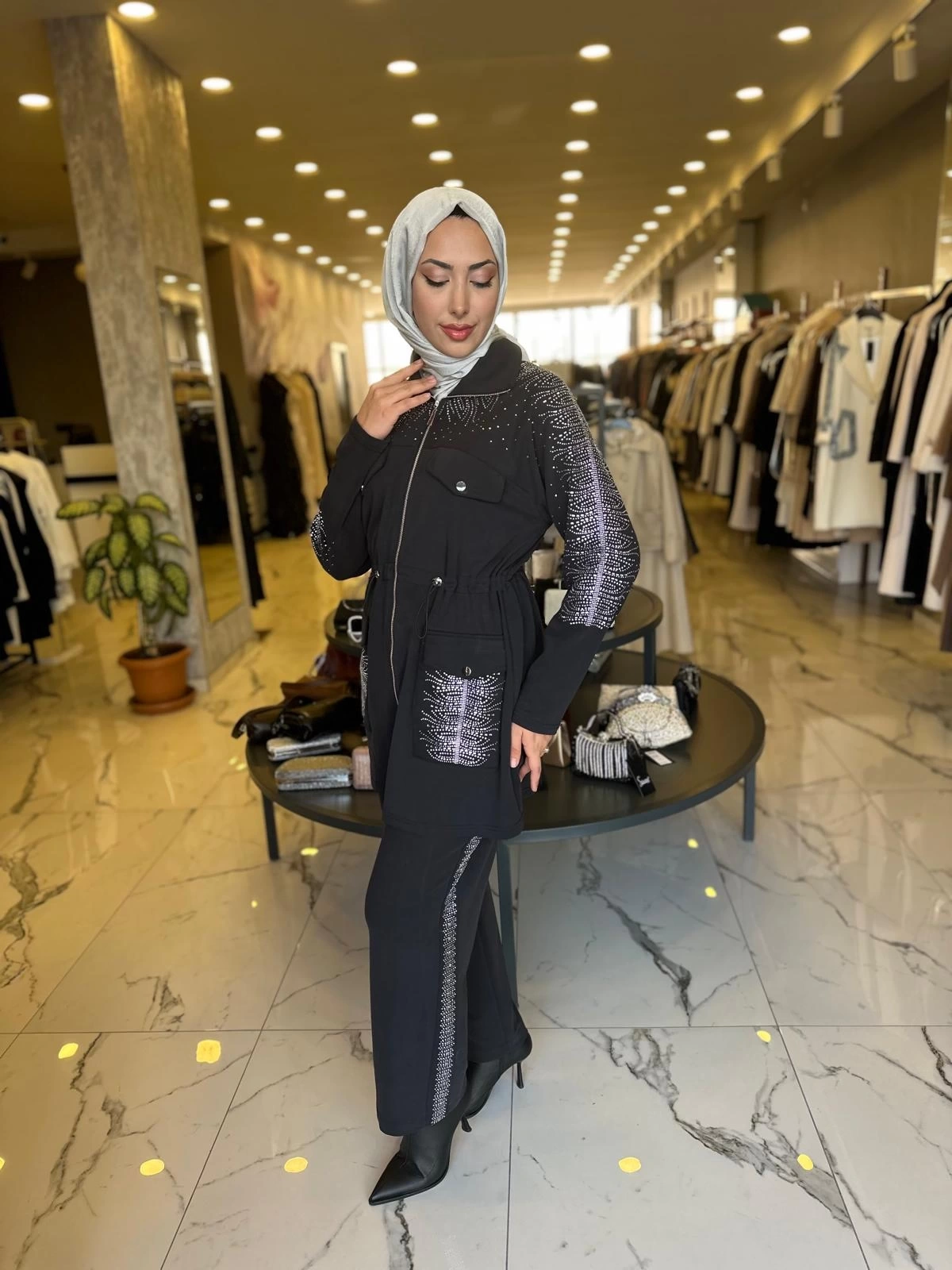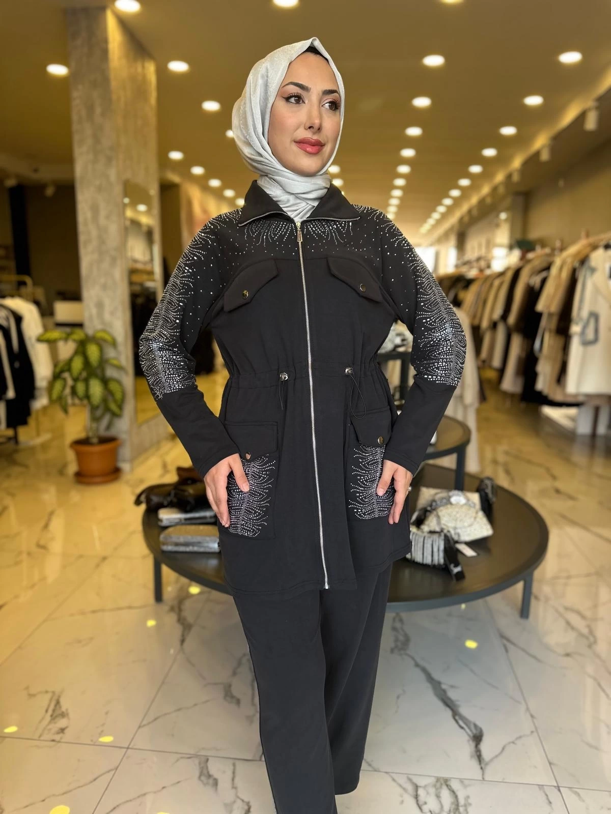 Merihce Luxury kalitesini her detayda hissedeceğiniz SOLİS-İKİLİ TAŞLI TAKIM SİYAH, gardırobunuzun vazgeçilmezlerinden biri olmaya aday.