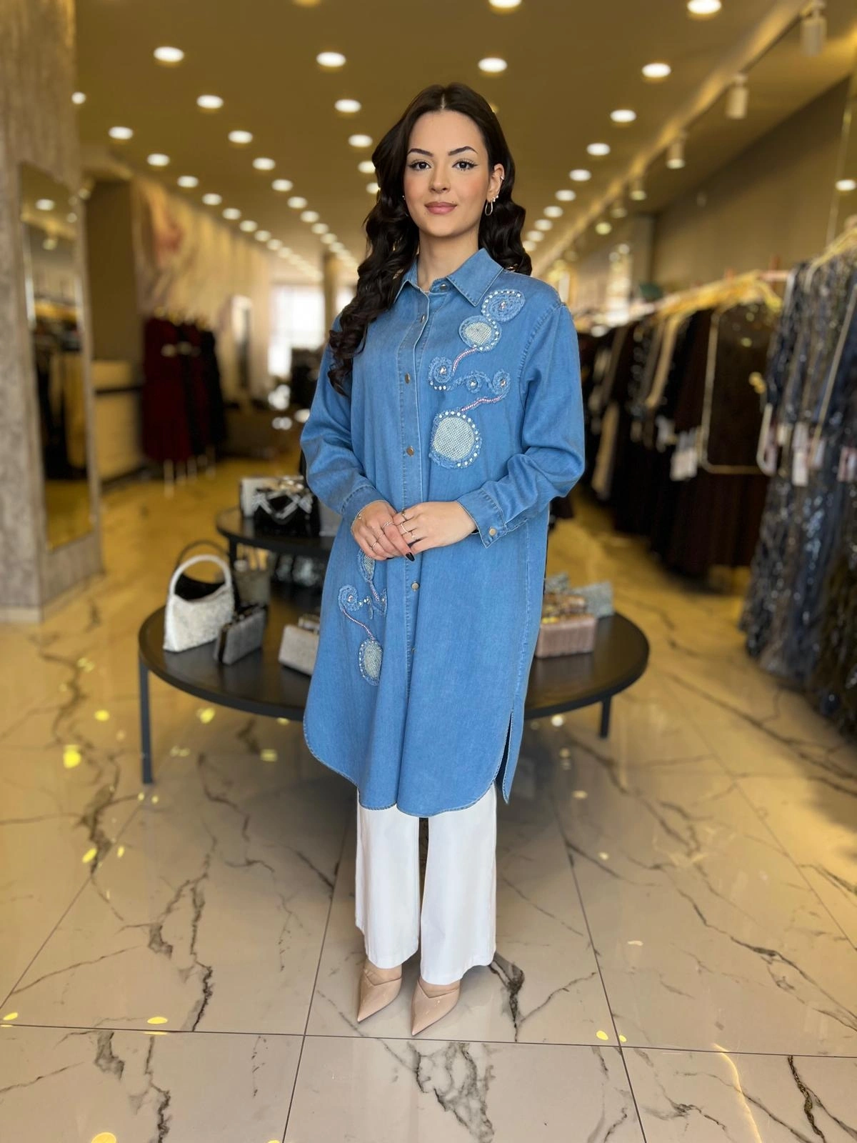 Merihce Luxury kalitesini her detayda hissedeceğiniz SOLİS-ÖNÜ DESENLİ KOT TUNİK AÇIK MAVİ, gardırobunuzun vazgeçilmezlerinden biri olmaya aday.