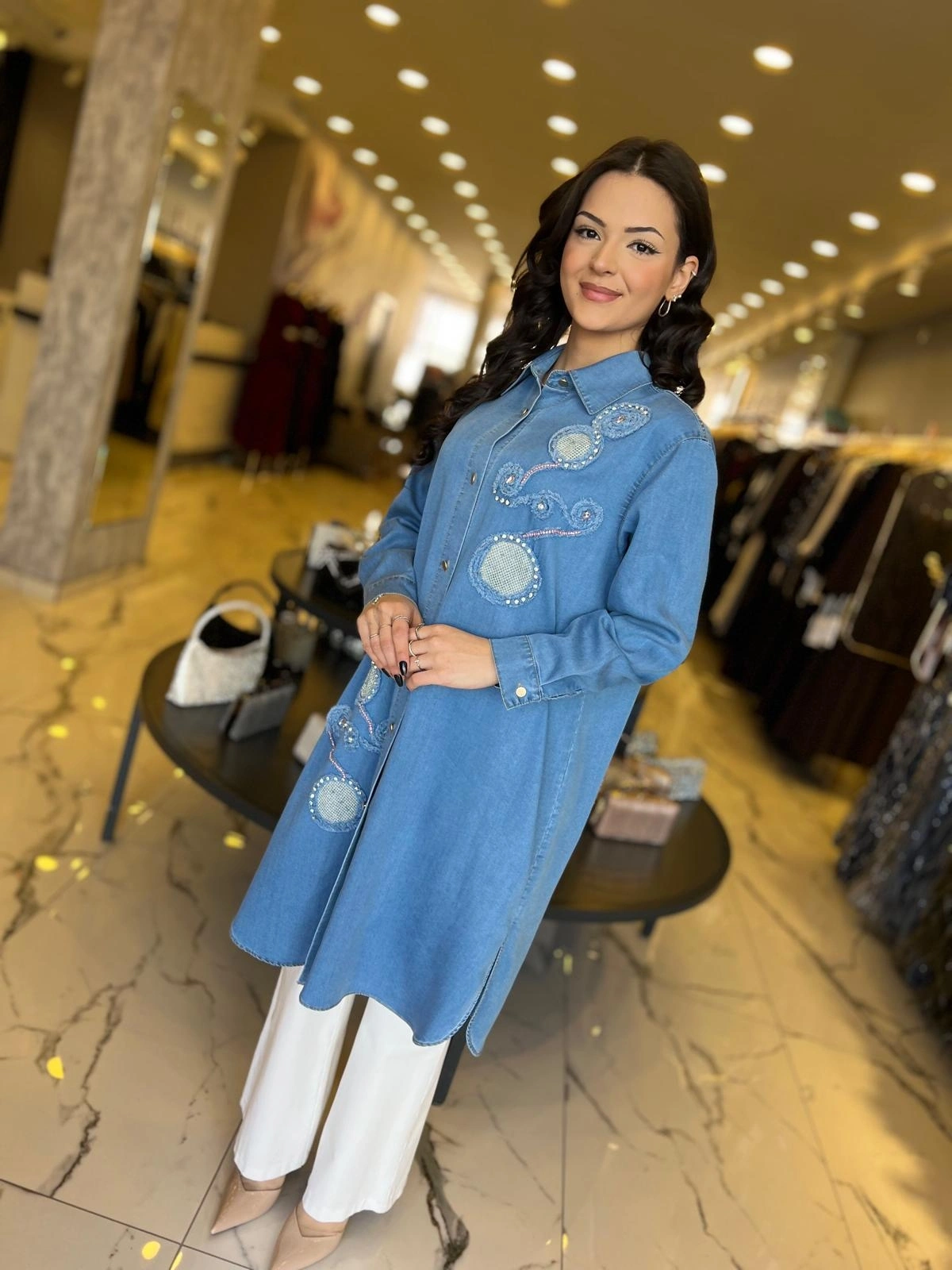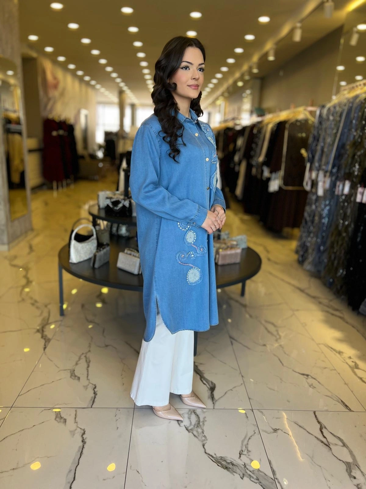 SOLİS-ÖNÜ DESENLİ KOT TUNİK AÇIK MAVİ ile Merihce Luxury'nin zarafet ve kalite anlayışını keşfedin. Koleksiyonumuzun bu seçkin parçası, stilinize lüks bir dokunuş katmak için özenle tasarlandı.