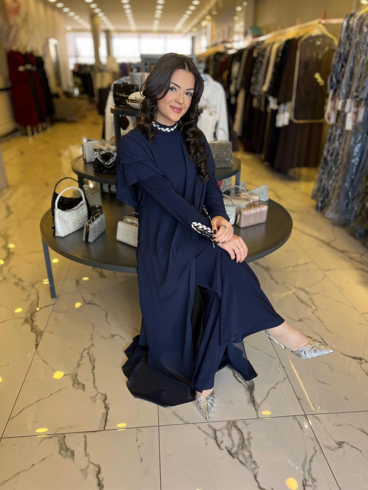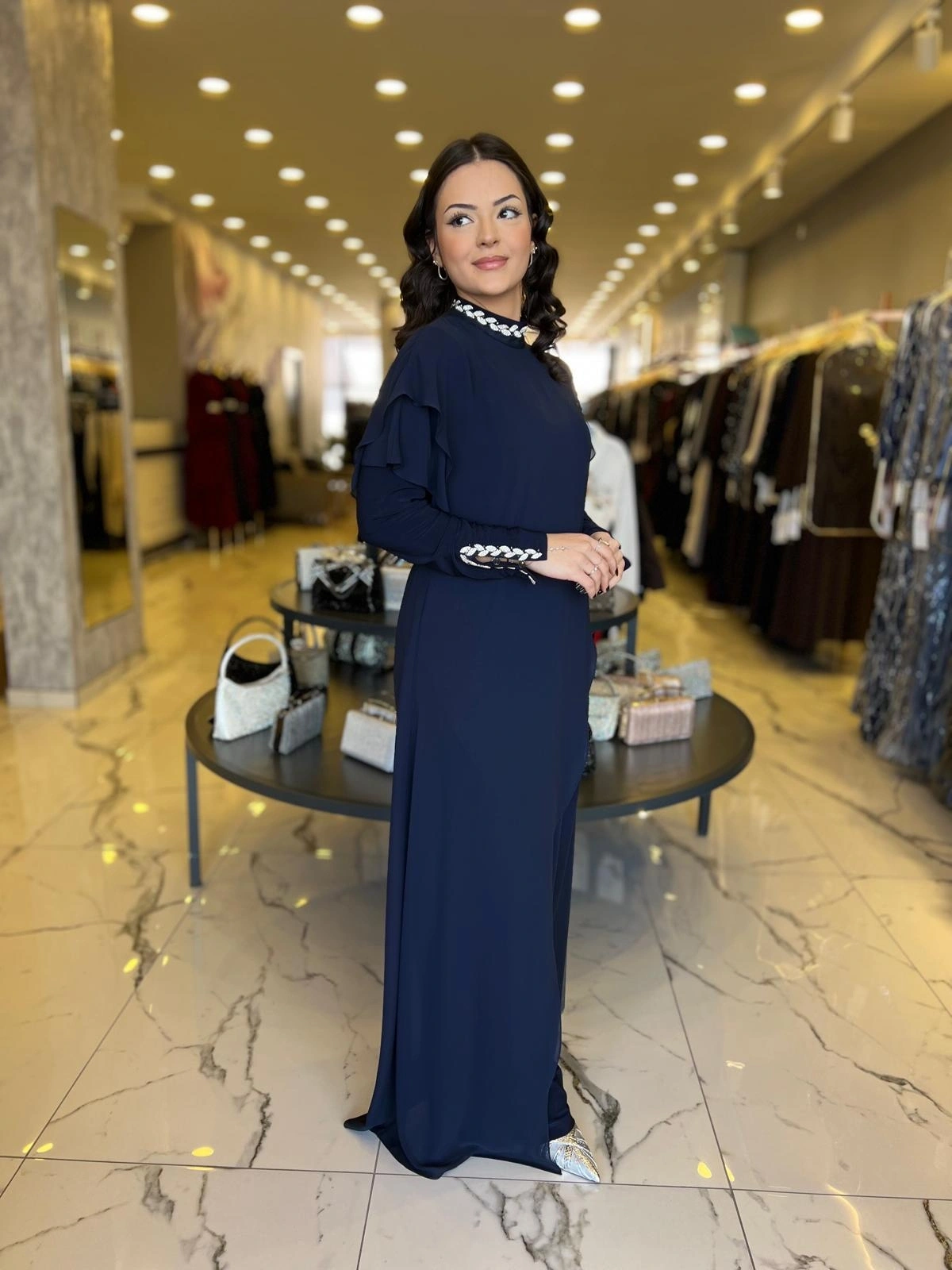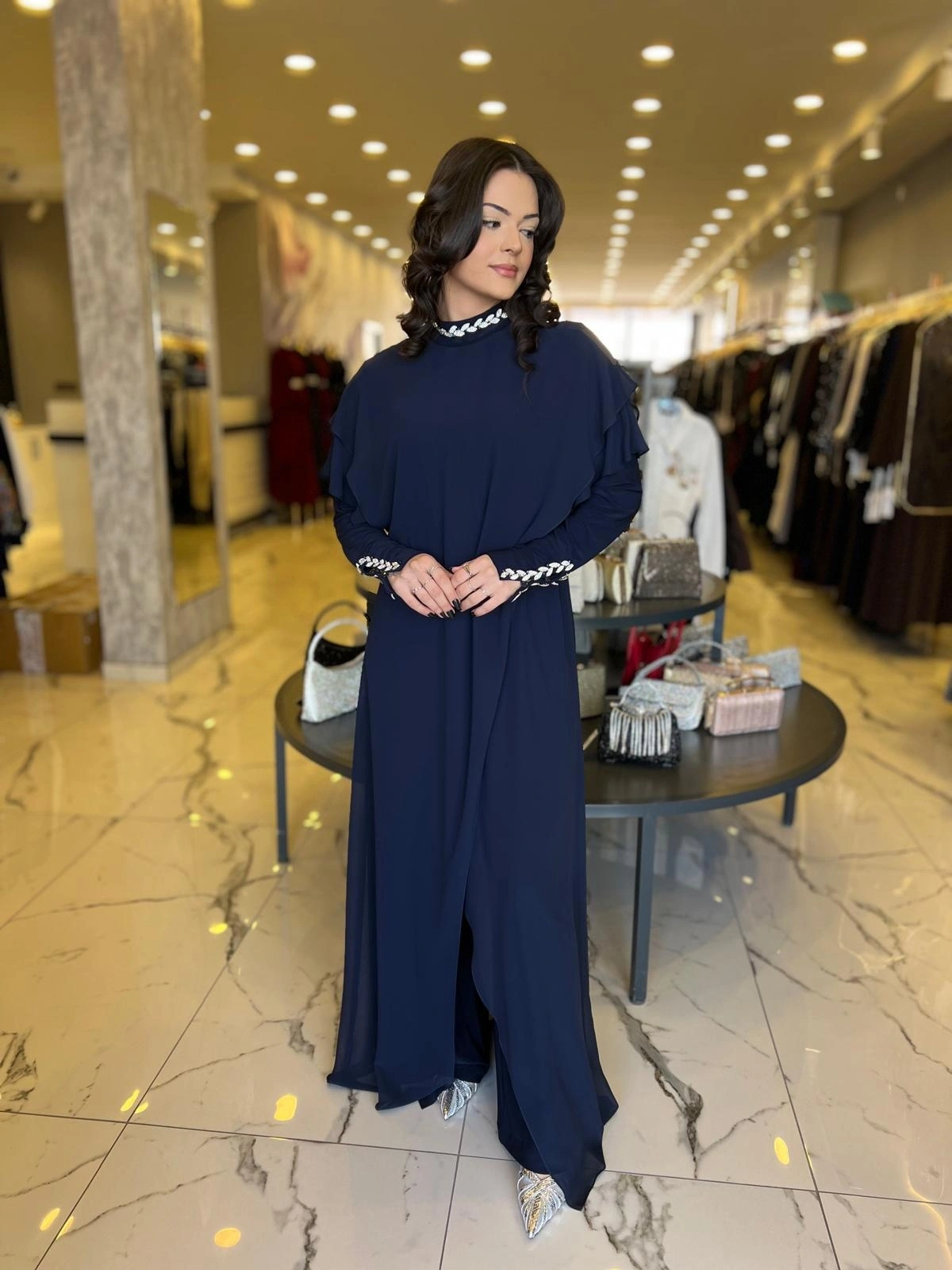 Merihce Luxury kalitesini her detayda hissedeceğiniz SOLİS-TAŞLI TULUM LACİVERT, gardırobunuzun vazgeçilmezlerinden biri olmaya aday.