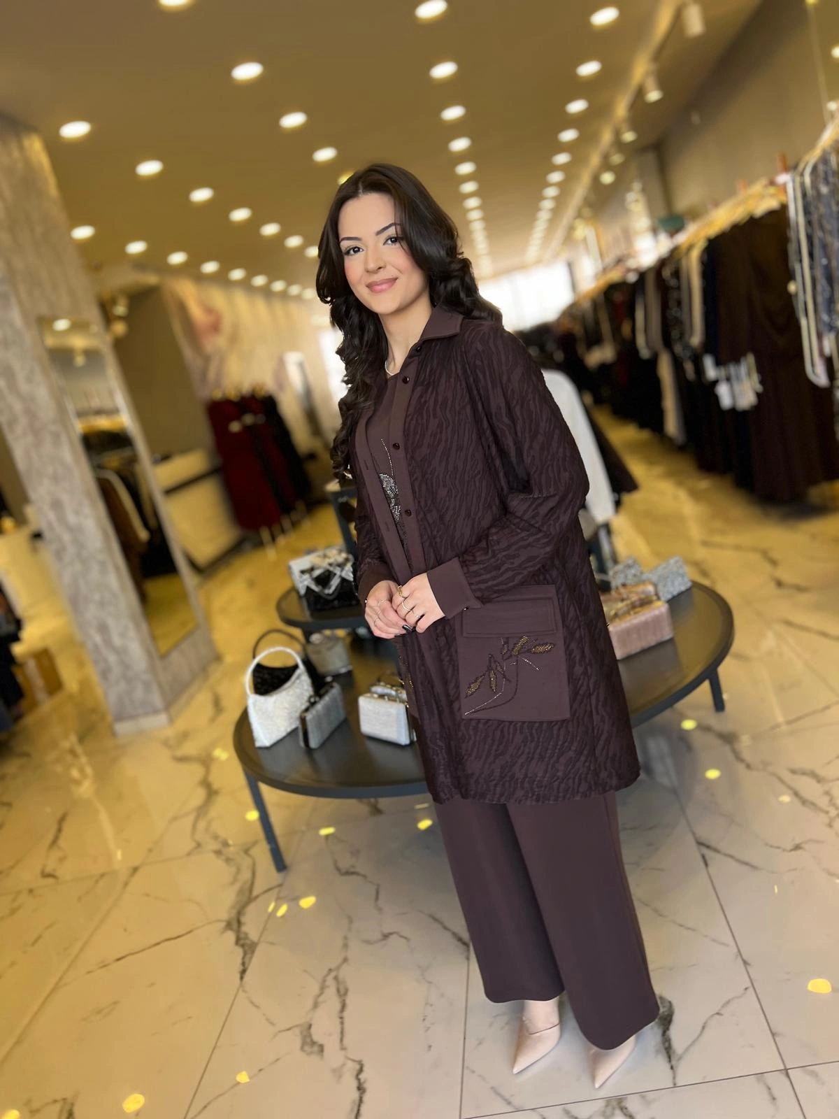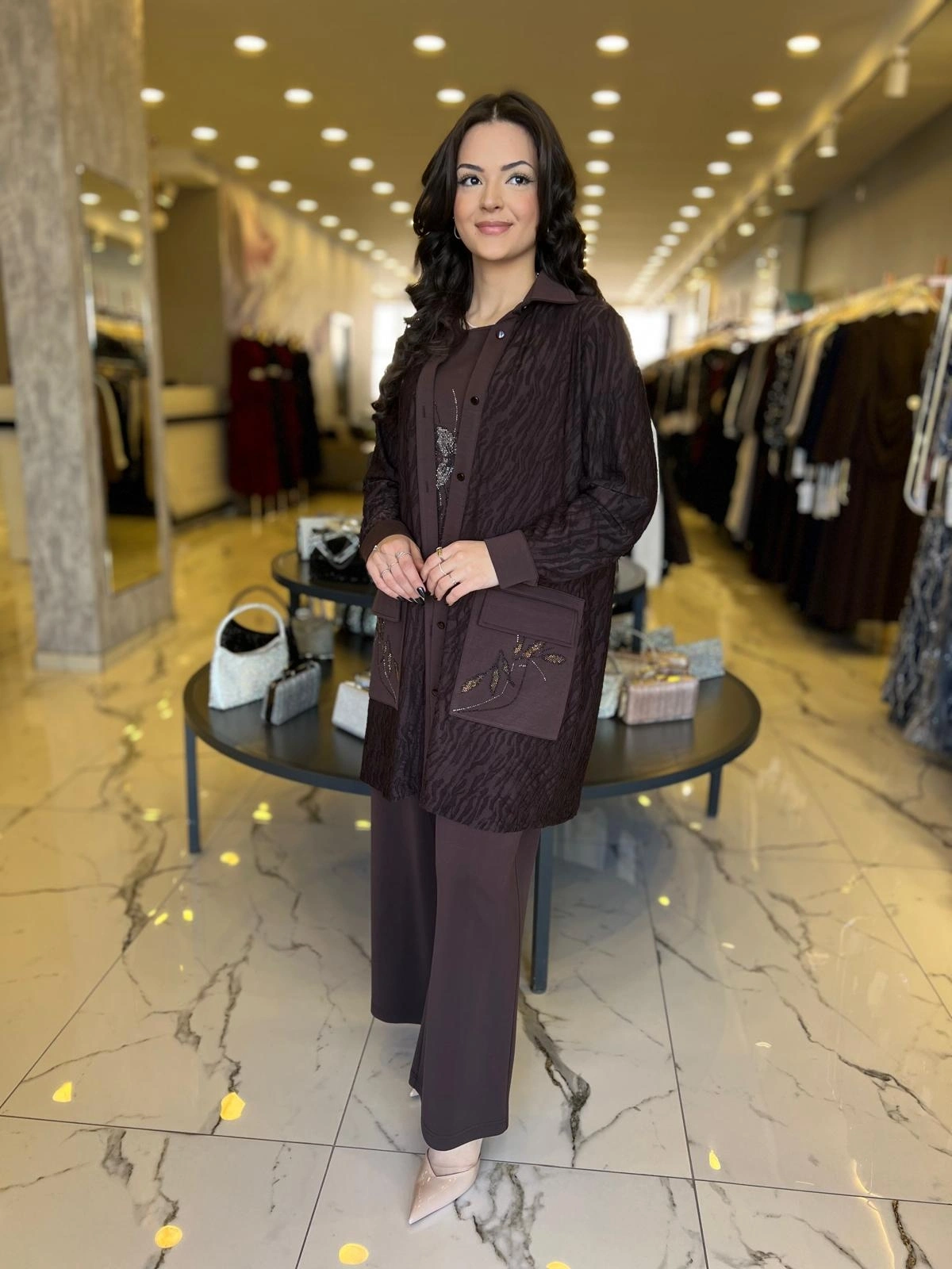 SOLİS-ZARİF ÇİZGİ 3 LÜ PANTOLONLU TAKIM KAHVE ile Merihce Luxury'nin zarafet ve kalite anlayışını keşfedin. Koleksiyonumuzun bu seçkin parçası, stilinize lüks bir dokunuş katmak için özenle tasarlandı.
